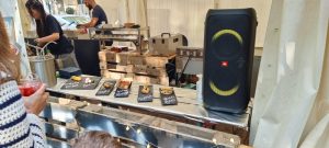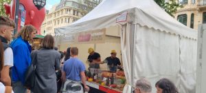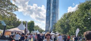 Beim durchlaufen des Festes blieben wir an einem Stand stehen, der scheinbar etwas mit Hartkäse macht und die zum Probieren in einem kleinem Becher aus Waffel scheinbar Vanilleeis mit Käse, Balsamico und einer Himbere oben drauf hatten. Tani und ich nahmen sich jeder einen gerade frisch gemachten, dabei bekam man einen Löffel aus irgendeiner Art Weizen, den man evt. essen könnte, der aber tatsächlich sehr hart und stabiel war. Daneben gab es eine kleine Bühne, auf der eine Opernsängerin sang. Daneben standen Fiats, unter anderem ein winziger Elektrofiat zweisitzer (nebeneinander) neu für gerade mal etwas unter 10.000€. Ich nannte Ihn „liebevoll“ Dixiklo auf Rädern. Zwischenzeitlich gegann ein schwarzer Herr spontan ein Lied mit der Opernsängerin auf der Bühne zu singen, scheinbar trafen die sich da spontan. Zuvor erklärte Sie, dass er zehn Jahre lang bei Starlightextress war. Dementsprechend gut konnte er singen, dementsprechend laut auch ohne Mikro und vor allem gut Stimmung gemacht. Danach ging er weiter übers Festival an uns vorbei. Wir gingen dann ebenfalls weiter bis zum Ende der Kö, wo eine große Wiese mit weiteren Ständen war. Zuvor wurden wir von einem HalloFrash Stand Mitarbeiter aber angelabert, wie dass zustande kam, habe ich nicht bemerkt, da ich sagte, dass wir selber nicht kochen, Tani aber aus Stolz sagen musste, dass nicht wir, aber Sie koch. Somit gab es zwischen den beiden ein Gespräch auf Englisch, bei dem ich mich die ganze zeit fragte, warum Englisch, vor allem, weil tani auch sagte, dass Ihr Englisch so lala ist (auf Englisch aber). Irgendwann, als er dann eine auf deutsch geschriebene Karte zeigte (was Tani nicht bemerkte) fragte ich auf Englisch, ob er auch Deutsch kann. Lachend bejahte er, worauf ich sagte, dass die kommunikation so dann wohl einfacher wäre. Nachdem wir Ihm