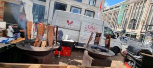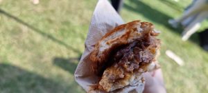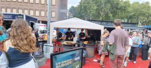 abgewimmelt hatten (Tani sagte auch, dass Sie lieber selbst Ihre Sachen einkauft), gingen wir weiter unseren Weg zum Ende der Kö. Hier waren hauptsächlich BBQ-Stände und ein Eiswagen mit einem Verkäufer, der aussah wie GHZ-Ralf aus dem OV. An einem Burgerstand gab es einen richtig aufgebauten Weg für eine Schlange und dementsprechend viele Kunden standen dort auch. Die hatten alleine fünf Mann an mehrere runde Grills (diese, wo das Feuer in der Mitte ist und aussenrum das Fleisch aufgelegt wird) die nur das Fleisch bzw.d ie Burger anfertigten. Zwei weitere waren an der Kasse und kümmerten sich um die Pommes und die Ausgabe. Die hatten nur ca. drei verschiedene Burger und als Beilage auf Wunsch Pommes. Dementsprechend sehr zügig gings auch durch die Schlange. Ich nahm mit den einfachsten Burger, einfach nur Brötchen, Bulette und geröstete Zwiebeln. Kaum bezahlt und schon stand der Burger so schnell da, dass ich sogar gefragt hatte, ob dass schon meiner ist. Neben dem lustigem Spruch „Smoke Meat every day“, was von Snoopdogg abgeleitet war, gab es sogar Frischetücher verpackt, die man