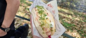 Wie immer war die gesammte Königsallee mit Buden vollgestellt. Direkt hinter Galeria, an dem wir vorbei gingen (und ich kurz mal dachte, dass die komplett alles wegen Schließung ausverkauffen, da es dort so leer erschien), standen drei Personen in riesen Bärenkostümen auf einer Bank und belustigten die Leute. Schon am Anfang und direkt am ersten Stand blieb Tani hängen: Flammlachs mit Trüsselsosse. Nach kurzem Überlegen und Einsicht, dass Sie schon apetit hätte, hat Sie einen bekommen. Obwohl ich Trüffel nicht so mag, hab ich ein paar Mal probiert und fand dies gar nicht schlecht