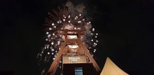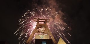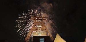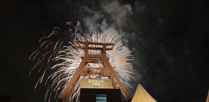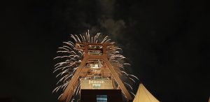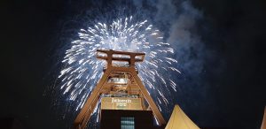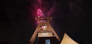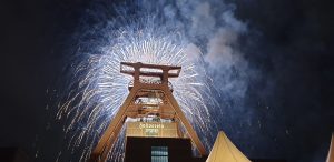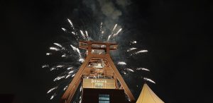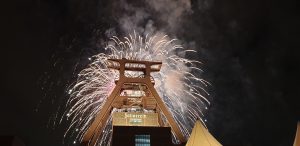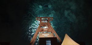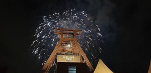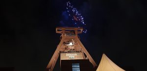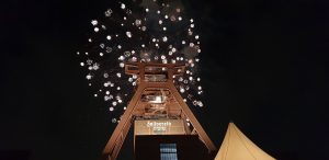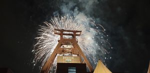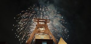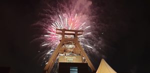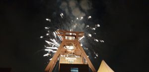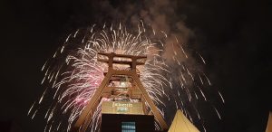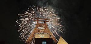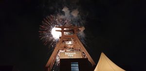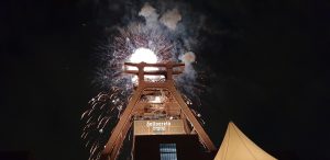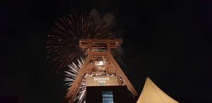 leider großteils von unserem Standort aus vom Zechenturm verdeckt war, es dafür aber ein paar besonders gute Fotos damit gab. Das Höhenfeuerwerk dauerte so um die 15 Minuten rum. Nach dem Essen war natürlich auch nach dem Regen und so holte sich Tani noch einen Wein und wir saßen uns in Strandstühle am großem Platz vom Tor 1 neben der großen Bühne hin. Nach dem Wein gingen wir noch zur DJ-Bühne und verblieben dort, bis der DJ mitten im Act aufgrund von Ärger des Veranstalters aufhören musste, da die Veranstaltung nur bis 22 Uhr ging und eine Minute drüber scheinbar schon nicht tragfähig ist. Wir gingen richtung Auto, aber vor der Heimfahrt zeigte mir Tani noch Ihr Bürogebäude, was früher die Waschkaue der Zeche war. Wir gingen einmal durch, ich schnorrte mir eine Bionade und dann spielten wir noch eine Runde an einer Accardmaschiene, sowie Tischkicker, bevor es heimwärts ging.