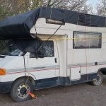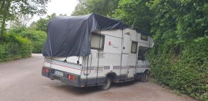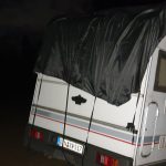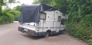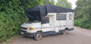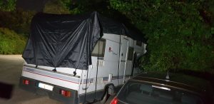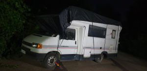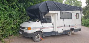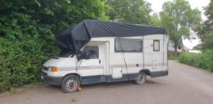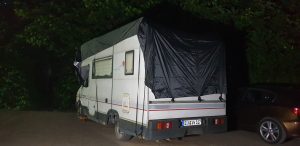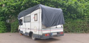 Maicontest 2024: Auch im Maicontest schliefen wir wieder auf der Sitzgruppe im Buli. Einige Wochen nach diesem Contest habe ich, da wieder Feuchtigkeit zu sehen war, eine Plane gekauft und den Buli damit abgedeckt. Dies tat ich, nachdem der Buli wieder auf den Kleingartenparkplatz stehen konnte. Die Plane ist ebenfalls keine Dauerlösung, immerhin aber eine dichtere.