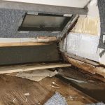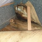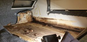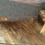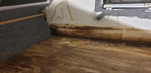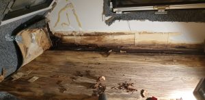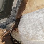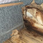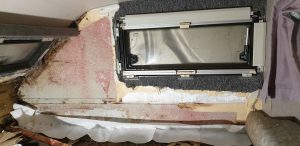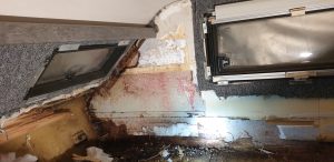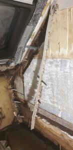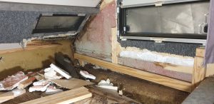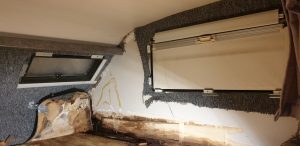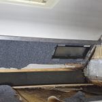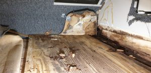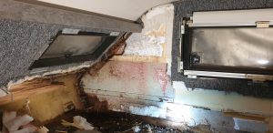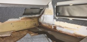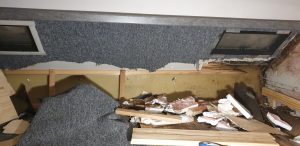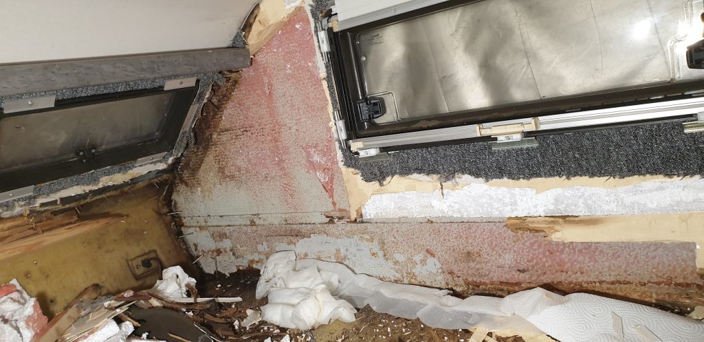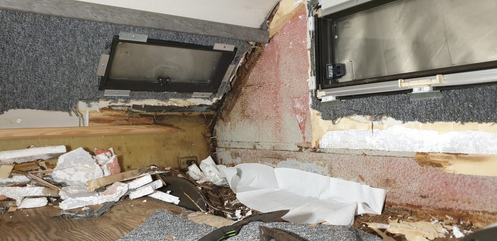 Und weiter ging die Sanierung am Alkoven des Bulis. Vorab habe ich erstmal das Wasser vom Dach des Bulis gelassen, waas sich dort auf der Plane wie in einem Swimingpool sammelte und minutenlang als Wasserfall erstmal nach unten lief und ein richtiges Loch im Boden des Parkplatzes geschossen hat. Danach gings weiter. Nachdem ich letztens schon den Teppich an der rechten Seite teilweise entfernte, entfernte ich diesmal auch den Teppich vorne im Alkoven im unteren Bereich durchgehend, um ein Brett dort abzuscharuben um dahinter zu schauen. Das vergammelte Holz habe ich wiedermal großteils mit dem Kärcher Staubsauger weggesaugt und weggekratzt. Einen Einmer voll großere Holzstücke für den Müll hat sich auch angesammelt. Des weitern entfernte ich den Vorhang im Alkoven, wie die Vorrichtung, um ein Stück Stoff als Absturzsicherung zu nutzen. Auch den Rahmen des rechten Alkoven Vorderfensters entfernte ich nun. Nach längerem entfernen des Holzes der rechten Wand sowie in der Ecke und leicht vorne kam ich an vielen größeren Stellen bis zum Außenblech des Bulis durch. Hier standen Schrauben, die außen zur Befestigung der Regenrinne und Seitenleiste montiert waren einfach spitz raus, wo die mal im vergammelten Holz verschraubt waren. Teilweise gibt es Styropor an der rechten Wand, den ich diesmal noch nicht mit entfernt habe. Die rechte Bodenplatte habe ich noch ein großes weiteres Stück nach links geschoben, um besser den unteren Teil begutachten zu können. Das dort im Boden verlaufende Kabel geht zum oberen Licht des Bulis, was ich nun erkennen konnte. Die Bettdecke und das Kissen habe ich nun auch mal aus dem Alkoven raus genommen, um mehr Platz zu haben. Es stellte sich raus, dass der Wasserschaden leider auch an der vorderen Wand nach links durchgeht. Wie weit kann ich noch nicht sicher sagen, aber schätzungsweise auch zimlich durch bis zum linkem Ende. Des weiteren gibt es einen neuen Schaden, bzw. wurde einer nun neu bekannt: Am Hauptfenster der Sitzecke (das Große) ist unten rechts eine Stelle feucht, da ist das Fenster wohl undicht und da schimmelt es auch schon…