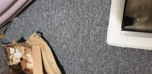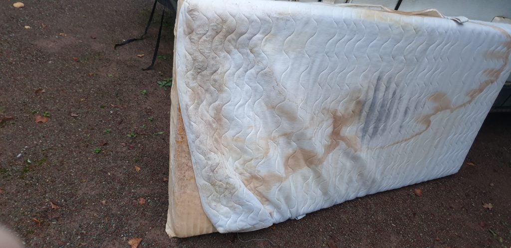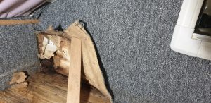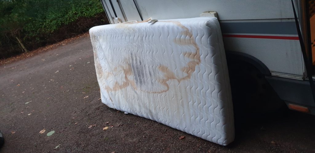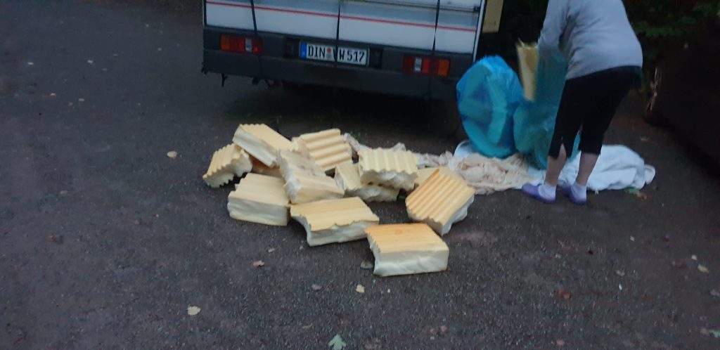 Oktobercontest 2024: Auch an diesem letzten Contest des Jahres schliefen wir wieder auf der Sitzgruppe statt im Alkoven. Zwischendurch hatte ich mal ein kleines Stück Teppich in der Ecke aufgemacht um den leider großen Schaden zu begutachten. Am Freitag vor dem Contest hatte ich einen Urlaubstag (Donnerstag war ein Feiertag, darauf hin habe ich mir einen Brückentag genommen) und an diesem den Buli für den Oktobercontest fertig gemacht. Neben dem Befüllen des Frischwassertanks mühselig via Kanister mit rund 70 Litern, nahm ich mir noch die alte, mittlerweile nicht mehr im Alkoven, sondern seit kurz nach dem letzten Contest quär im Buli liegende Matratze in Angriff. Nach Überlegungen, wie man diese am besten entsorgt, kam meine Mutter auf die Idee, diese einfach klein zu schneiden und in Müllsäcken zu entsorgen (diese Stücke dürfen ganz legal in den Hausmüll). Mit der Miniaxt im Buli war dies auch sehr schnell getan. Es folgen Bilder dazu vom Freitag: