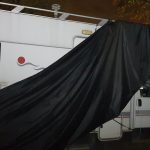 Um größeren Schaden an der Undichtigkeit zu vermeiden, habe ich eine Plane auf Amazon bestellt und am Tag der Lieferung diese abends nach der Arbeit im dunklem noch so gut es geht dran gemacht. Glück: Am nächstem Tag gab es direkt stärkeren Regen.
