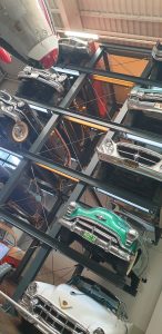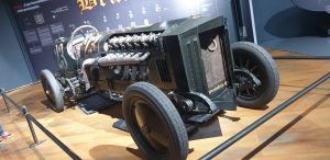 Darauf folgend kamen wir zu einer kleinen Halle, eig. ehe eine kleine Nische, in der nur ein Fahrzeug stand: Der „BRUTUS“ Dies war ein einzelstück, gebaut nach dem Vorbild einer Cohiba-Zigarre. Als Motor hatte dieser einen 550 PS (400KW) starken 47 Liter BMW VI Flugmotor (gebaut ab 1925 für Kampfflugzeuge und Flugboote, dieser stammt aus einem Flugzeug aus dem spanischem Bürgerkrieg und lag jahrelang auf dem Schrottplatz). Dieses Fahrzeug mit seinen 47 Litern Hubraum (ich muss dass nochmal betonen!) wog 2537 kg (Leergewicht) und brachte 2537 Umdrehungen die Minute. Das Fahrzeug war 5,5m lang, 1,8m breit und 1,6m hoch. Das Fahrzeug hat 34Zoll Holzräder mit Vollgummireifen und ist Flüssiggekühlt.Der Verbrauch beträgt 80 Liter auf 100 km. Das Fahrzeug ist übrigens kein reines Ausstellungsstück sondern soweit fahrtauglich und wird auch hin und wieder (leider nicht als wir da waren) vorgeführt.