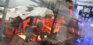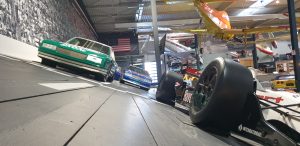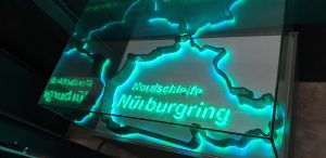 Dann kamen wir zur einem Raum mit einer Ausstellung zum Nürburgring. Hier gab es ein paar Farhzeuge sowie die Geschichte des Rings inklusiver eines 3D Modells des Nürburgrings (3D gedruckt, das gleiche Model, was ich schon mit dem 3D-Drucker gedruckt habe, nur viel größer skalliert), schön beleuchtet undmit der Möglichkeit, auf einem Touchscreen Streckenabschnitte zu wählen, die im Modell dann aufleuchteten. Traurigerweise leuchteten immer die falschen Stellen auf und nicht die, die man angeklickt hatte. Da gab es leider einen Fehler drinnen. Zwischendurch haben wir uns übrigens an einem Roboterarm als Souviner eine Münze von Speyer gekauft, der Roboterarm hat uns diese dort gegeben. Einen 0€ Schein von Sinsheim haben wir ebenfalls noch an einem Automaten gekauft.