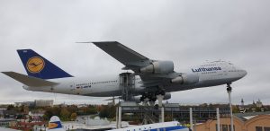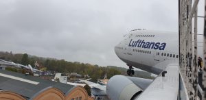 Weiter gings draußen zu einer Antonow Frachtmaschiene, in der man ebenfalls rein konnte, auch in den Laderaum. Dann gings zu einem weiterem Highlight in Speyer: Die Boing 747. Diese war sehr weit oben auf Pfälen montiert und stand in einer leichten Schräge. Über Treppen gelangte man zu der Boing zum Eingang und konnte rein. Dies war definitiv das mit Abstand größte Flugzeug, das wir besichtigt hatten. Teile des Bodens und der Wände wurden entfernt, sodass man den Innenraum und die Technik sehen konnte. Ebenfalls gelangte man nach unten in die Frachtkammer sowie zum Cockpit und die davorstehenden SItze der ersten Klasse. Der Weg zum Cockpit hoch über eine schmale Wendeltreppe war ein wenig erschwerend, da das Flugzeug nicht gerade stand. Über einen weiteren Ausgang gelang man auf eines der Flügel der Maschiene, über den man auch laufen konnte. Von hier hatte man eien gute Sicht auf die weite Umgebung, die nur durch das diesig verregnete Wetter ein wenig behindert war.