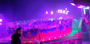 Tani ging zum nebenstehendem Stand und holte sich ein Bier, wärend ich versuchte, die Sache zu regeln. Über Umwege kam ich an die SSH Zugangsdaten von Vitaly, die eigetlich für meine App bestimmt waren und von da regelte ich das Ganze. Dann kam ich zur Tani, wir schnappten und am Stand dort ein Sitzpülatz und ich holte Ihr einen Glühwein und mir eine heiße Schokolade mit Amaretto. Danach gingen wir noch zwei mal über die Kirmes. Am meisten angetan hat der Tani das Fahrgeschäft „Vodoo Jumper“, da es jedes Mal ein anderes Programm bot und abwechslungsreiche Technomusik dabei spielte. Wir bleiben da mehrfach stehen und schauten uns ein paar Runden an. Gegessen haben wir diesmal an einem Stand, an dem es Paste aus dem Käseleib gab, was wir nahmen. Nach dem Essen ging Tani in der Nähe Lulu und dann gingen wir noch eine Runde. Im engem Gedrängel genau in der Ecke mit dem Pastastand hatten wir ein kurzes nettes Gespräch mit einer Frau, die versuchte, Ihren Glühwein durch die Menge zu manövrieren. Ein Tag zuvor war ich übrigens freitag abends bei meinem Großelten, bei denen man aus dem Küchenfenster aus die Kirmes sehen konnte.