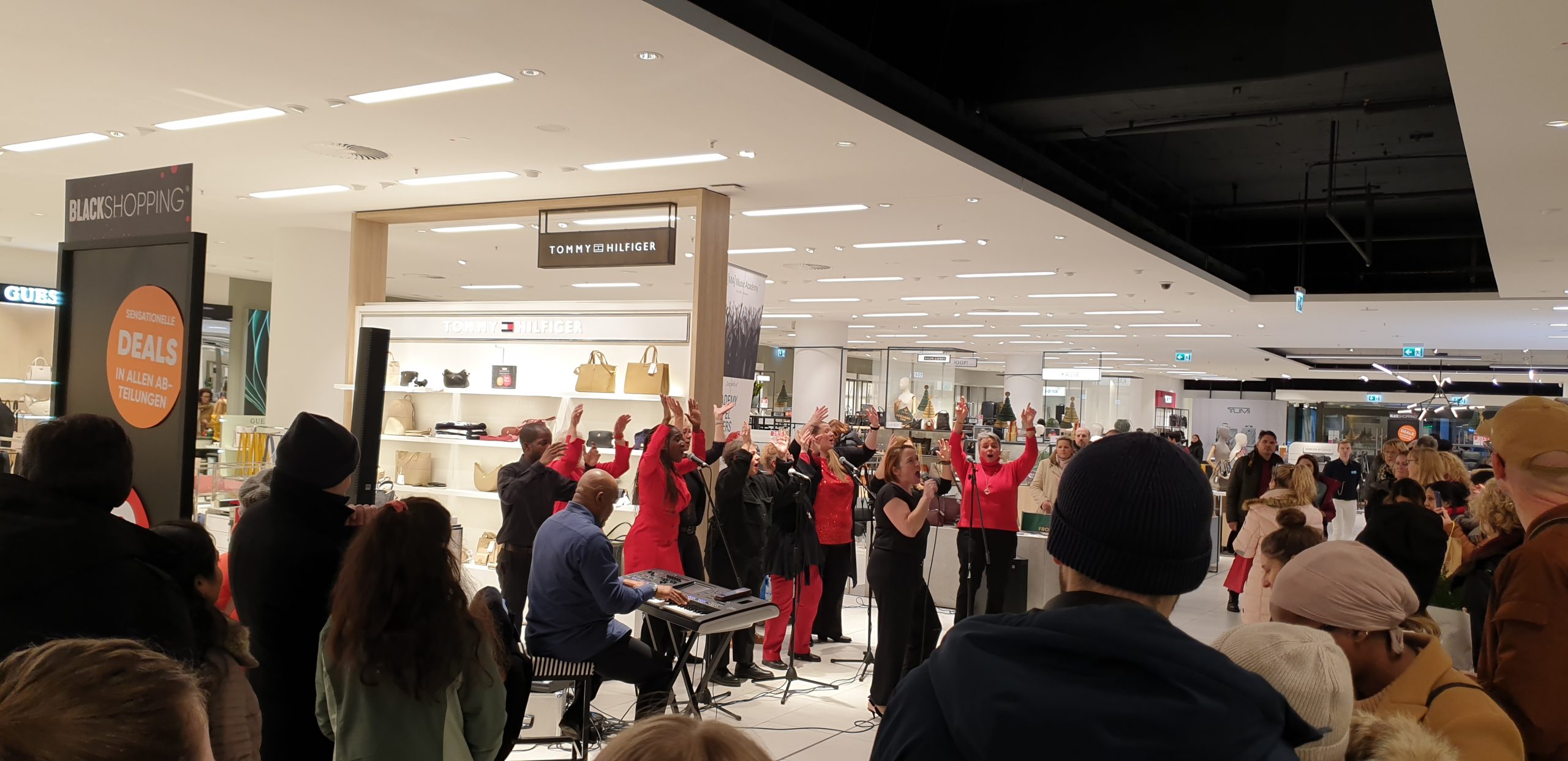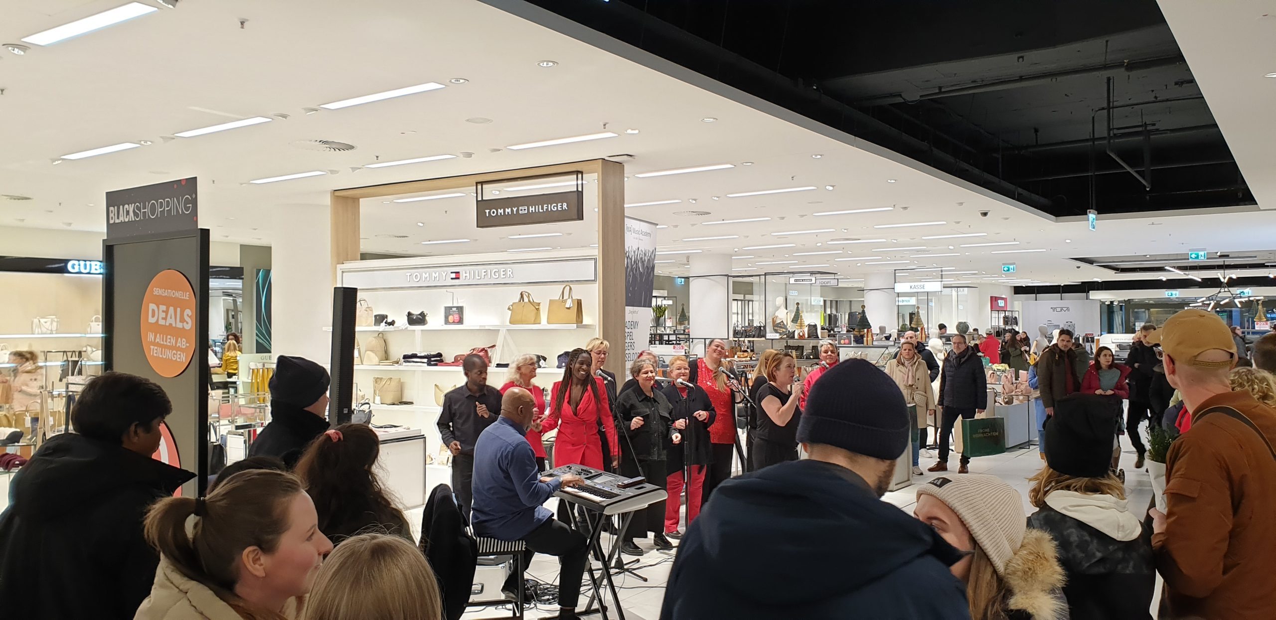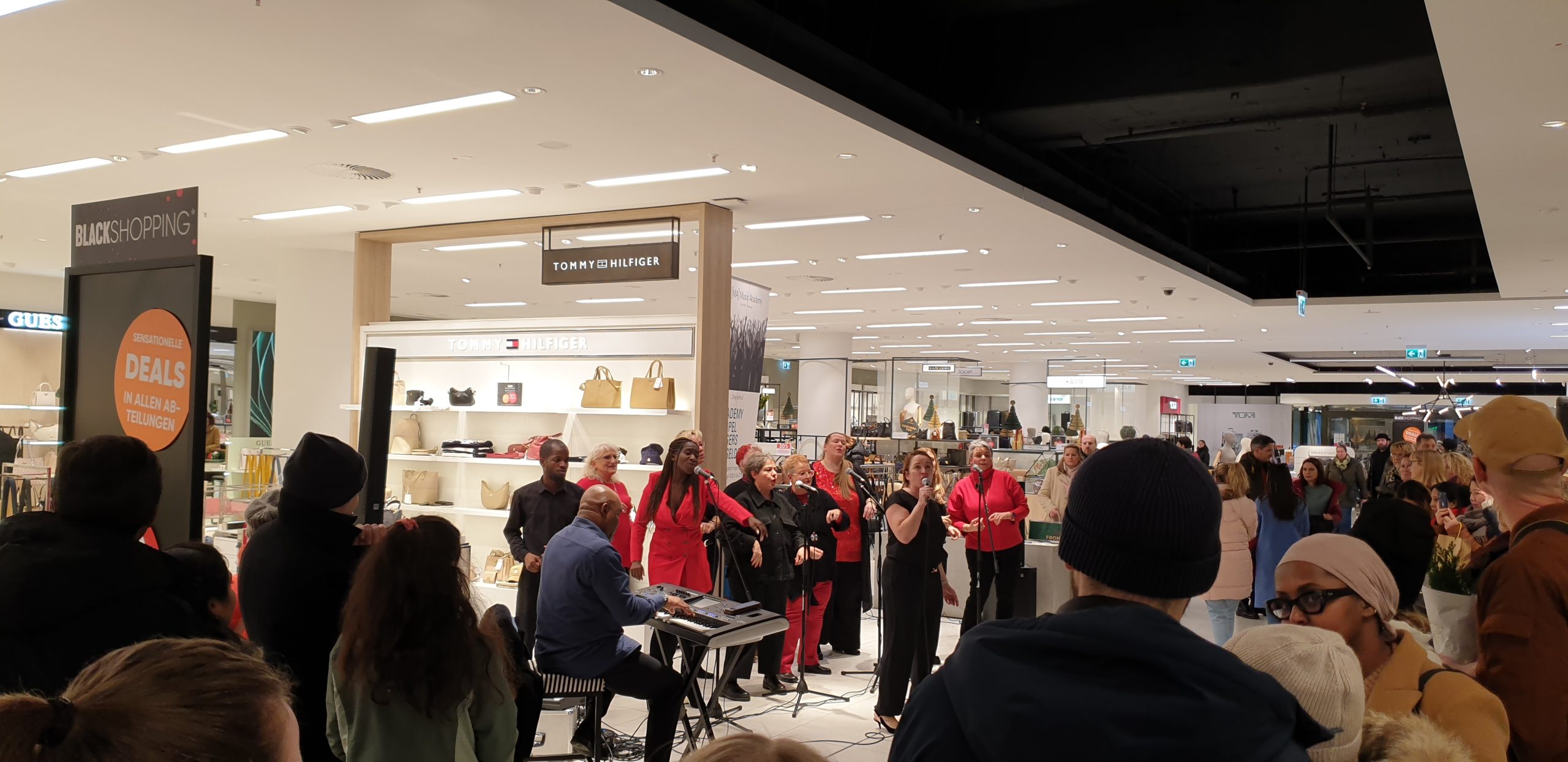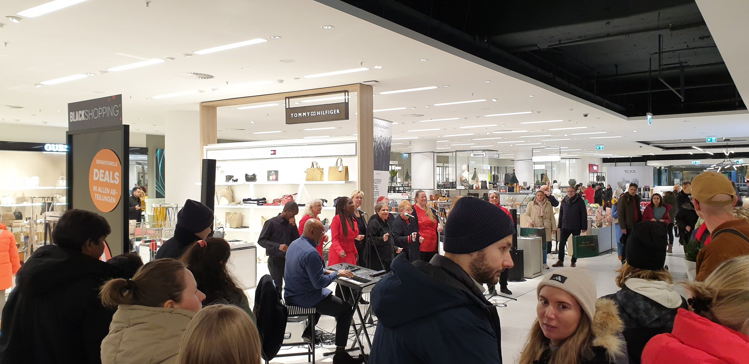 Dort schlichen wir ein wenig rum, Tani schaute sich Handtaschen an, wärend ich kurz hoch ging um nach Batterien (CR123A für den Shelly Wassersensor) schaute, die die leider nicht hatten. Ich war auch miuten später wieder unten und fand Tani an den Ringen. An den Handtaschen gab es ein Livechor, die Weihnachtslieder sangen, typisch Düsseldorf eben, ein wenig mehr Extras als sonst wo. Es gab auch ein Stand mit kaffee und Waffeln, von dem ich im nachhinein nicht sicher bin, ob es da nicht sogar was kostenlos gab.