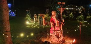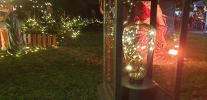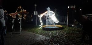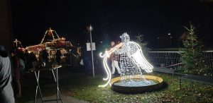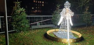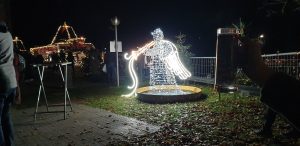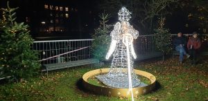 Wir gingen zu einem Stand auf eines der Schiffe, an dem Tani am Freitag (dem Tag zuvor) mit Ihren Eltern schon einen Wichtel gekauft hat. Dort kaufte Sie noch einen. An einem anderen Stand wollte Sie ein süßes Geschirrtuch mit zwei Katzen drauf kaufen, was Sie am tag zuvor mit Ihren Eltern gesehen hatte. Kaufen wollte Sie dies aber mir mir zsuammen. Leider war dies schon weg und es gab keines mehr davon. Wir gingen weiter zum hinterstem Eck des Weihnachtsmarktes, wo eine leuchtende Engel-Statue stand und es ein Glühweinstand gab, an dem Tani ein Glühwein bekam. WIr setzten uns dort auf eine Parkbank ein wenig hin. Danach gingen wir allmälich zurück, zum Spanferkel-Stand, der auf die Frage, ob die heute noch was hätten leider mit „da sind wir leider fünf Minuten zu spät“ antwortete.