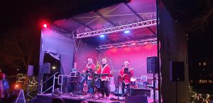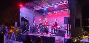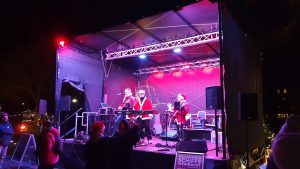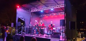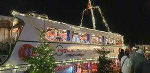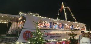 Ich zahlte mit Karte an dem SumUp Geräte, von dem wir das selbe bei mir auf der Arbeit seit kürzerem haben, was ich Tani auch mitteilte. Wir gingen zur Bühne, die quasi hinter dem Metstand stand. Dort waren drei als Nikolaus verkleidete Musiker, die typische Weihnachtslieder und ähnliches sangen und spielten. Die waren soweit ganz okay, es war ehe eine Hobbyband, was zeigte, dass deren Mischpult größtenteils auf einem Tablet gesteuert war. Eine Frau tanzte dort sichtlich angeheitert vor der Bühne rum. An der Bühne stand ein Rucksack einsam rum, was mich ein wenig nervös machte, bis ich dann sah, dass dieser der tanzenden Frau gehörte. Wir holten noch einen Met und gingen dann ein wenig in die Schiffe, in denen Stände aufgestellt waren, an denen Zeugs verkauft wurde. Im erstem Schiff wurde z.B. viel aus Holz verkauft, unter anderem auch ein Schachbrett.