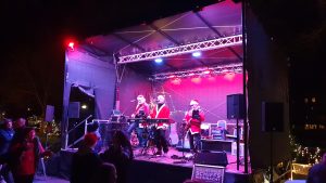 Ich zahlte mit Karte an dem SumUp Geräte, von dem wir das selbe bei mir auf der Arbeit seit kürzerem haben, was ich Tani auch mitteilte. Wir gingen zur Bühne, die quasi hinter dem Metstand stand. Dort waren drei als Nikolaus verkleidete Musiker, die typische Weihnachtslieder und ähnliches sangen und spielten. Die waren soweit ganz okay, es war ehe eine Hobbyband, was zeigte, dass deren Mischpult größtenteils auf einem Tablet gesteuert war. Eine Frau tanzte dort sichtlich angeheitert vor der Bühne rum. An der Bühne stand ein Rucksack einsam rum, was mich ein wenig nervös machte, bis ich dann sah, dass dieser der tanzenden Frau gehörte. Wir holten noch einen Met und gingen dann ein wenig in die Schiffe, in denen Stände aufgestellt waren, an denen Zeugs verkauft wurde. Im erstem Schiff wurde z.B. viel aus Holz verkauft, unter anderem auch ein Schachbrett.