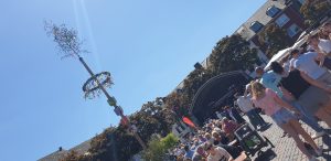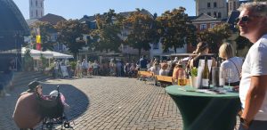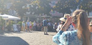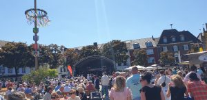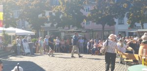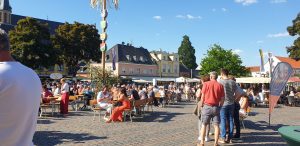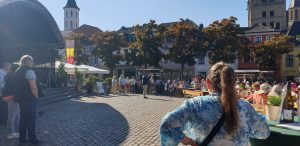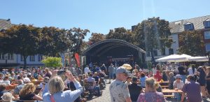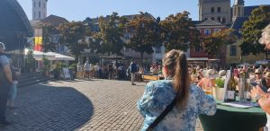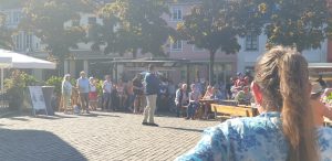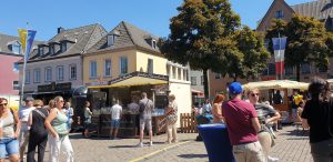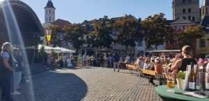 Wir gingen erstmal eine Runde um das Fest und schauten uns alle Karten an. Tani entschied sich dann für einen Stand nahe der Bühne und wollte einen Würzer bestellen. Leider wurde Sie vertröstet, da sie diesen nicht mer hatten, empfehlten aber einen anderen, rose Wein, den Tani dann als kleines Glas (0,1L) nahm. Dieser war sehr gut, wohl das erste Mal, dass Tani so einen lieblichen in rose hatte. Danach ging es weiter zum nächstem Weinstand, an dem es ebenfalls nur Alternativen gab. Tani nahm direkt ein 0,2er Glas, leider war der Wein dann doch nicht so gut und sehr sauer. Auf der Bühne stellte sich in der Zwischenzeit ein Orchester namens „Mr. Queens Big Band“ aus der Marienschule Xanten auf, was unter Anderem Songs von den Beatels spielte. Wir bekamen zwischendurch einen Sitzplatz auf einer Bierbank mit Tisch, an dem Tani und ich uns relativ lange gegenübersitzend aufhielten.