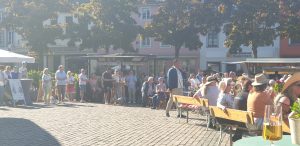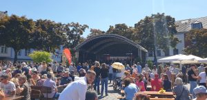Wir gingen erstmal eine Runde um das Fest und schauten uns alle Karten an. Tani entschied sich dann für einen Stand nahe der Bühne und wollte einen Würzer bestellen. Leider wurde Sie vertröstet, da sie diesen nicht mer hatten, empfehlten aber einen anderen, rose Wein, den Tani dann als kleines Glas (0,1L) nahm. Dieser war sehr gut, wohl das erste Mal, dass Tani so einen lieblichen in rose hatte. Danach ging es weiter zum nächstem Weinstand, an dem es ebenfalls nur Alternativen gab. Tani nahm direkt ein 0,2er Glas, leider war der Wein dann doch nicht so gut und sehr sauer. Auf der Bühne stellte sich in der Zwischenzeit ein Orchester namens „Mr. Queens Big Band“ aus der Marienschule Xanten auf, was unter Anderem Songs von den Beatels spielte. Wir bekamen zwischendurch einen Sitzplatz auf einer Bierbank mit Tisch, an dem Tani und ich uns relativ lange gegenübersitzend aufhielten.