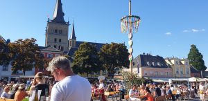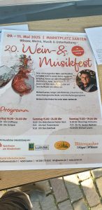 vom 09. Mai bis zum 11. Mai 2025 war in Xanten das 20. Wein- und Musikfest. Wir waren am Muttertag, Sonntag den 11. Mai dort, da es Tani am Samstag nicht so gut ging.Wir fuhren gegen Mittag dort hin und suchten erstmal einen Parkplatz. Auf den normalen Parkplätzen haben wir hinter der Volksbank nirgens was gefunden, weswegen wir die Straße weiter hoch gefahren sind, in einer Wohnsackgasse, wo wir am Sraßenrand bisher immer was fanden So auch heute gefühlt an der sleben Stelle, wie das letze Mal. Wir gingen erstmal kurz zur Volksbank, etwas Bargeld abholen, was man bei so einem Fets durchaus mal brauchen kann. Dann gingen wir erstmal zum Fest. Dies war auf dem Marktplatz mitten in Xanten. Direkt gesehen: Es war zumindest schonmal größer als vor kurzem das Hopfen und Traubenfest in Köln. Eine Bühne war auch aufgebaut.