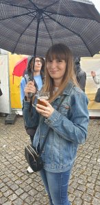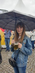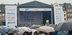 Als erstes gingen wir zu einem Bierstand an einer Bühne, an dem es japanisches Bier gab, was Tani probieren wollte. Interessanterweise gab es dort Personal, welches mit Schildern „Hier Ende der Schlange“ am Ende der Schlangen standen und die Leute ein wenig auf mehrere Schlangen verteilten. Wir kamen zimlich sofort dran, nachdem einer der Schlangeneinweiser uns zu einer leeren Kasse geschickt hat. Wir standen mit einem offenen Schirm von Tani an der Bühne und sahen ein wenig einem japanischem Orchester zu, wärend Tani Ihr Bier trank. Nachdem wir das Glas zurück brachten (dank einem Schlangeneinweiser, der meinte, wir können auch direkt da hin,w enn wir nur abgeben wollen, ging dies auch sehr schnell), gingen wir ein wenig weiter. Auf der Wiese waren einige Stände aufgebaut, unter anderem einen, der Kartons für je 40€ verkaufte, in denen eine Überraschung drinnen ist, von der man davor überhaupt keinen Schimmer hat, was da überhaupt grob drinnen sein sollte und trotzdem kauften die Leute komischerweise das Zeug.