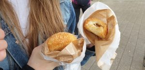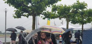 Auch ein Stand mit buntem Eis gab es. Das Wetter wurde zunehmend verregneter und unangenehmer. Auf den Wiesen standen überall Pavellions und Zelte, in denen die Leute scheinbar auf der Veranstaltung übernachteten. Eine Person in so einem Dinokostüm lief da auch herrum. Als wir schließlich zur anderen Seite gehen wollten, holten wir uns an einem Stand diese dreieckige Suschis, die im Blatt verpackt sind und dessen Verpackung relativ komplitziert aufzuziehen sind (gibts auch bei Aldi). Diese aßen wir aber nicht, sondern ich verstaute die erstmal in meine Jacke, wo sie schlussendlich auch bis daheim bleiben sollten. Wir gingen weiter durch die Stände, bei weiterhin zunehmenden Regen. Immer wieder sahen wir komische Gestalten, seltsame Kostüme und ähnliches.