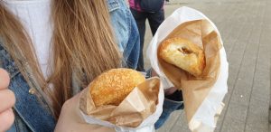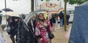 Auch ein Stand mit buntem Eis gab es. Das Wetter wurde zunehmend verregneter und unangenehmer. Auf den Wiesen standen überall Pavellions und Zelte, in denen die Leute scheinbar auf der Veranstaltung übernachteten. Eine Person in so einem Dinokostüm lief da auch herrum. Als wir schließlich zur anderen Seite gehen wollten, holten wir uns an einem Stand diese dreieckige Suschis, die im Blatt verpackt sind und dessen Verpackung relativ komplitziert aufzuziehen sind (gibts auch bei Aldi). Diese aßen wir aber nicht, sondern ich verstaute die erstmal in meine Jacke, wo sie schlussendlich auch bis daheim bleiben sollten. Wir gingen weiter durch die Stände, bei weiterhin zunehmenden Regen. Immer wieder sahen wir komische Gestalten, seltsame Kostüme und ähnliches.