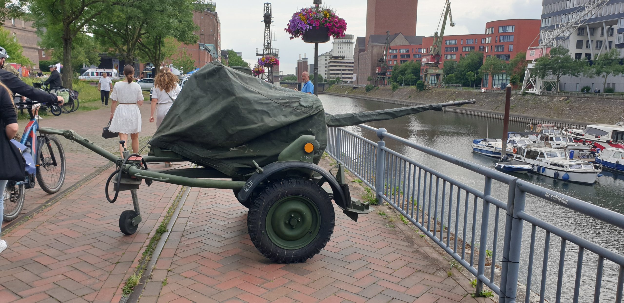 Am Sonntag, dem 15. Juni 2025 fuhren wir nach Duisburg zum Innenhafen. Dort fand eine Drachenbootregatta statt. Wir fuhren erst gegen Nachmittag los, da zuvor noch Haushaltstag war. Wir parkten am LZPD, dort gibt es, neben dem großem Streifen, auf dem man nicht parken darf (worauf wir vergangene Extraschicht noch von einem Nachtwärter hingewiesen wurden). Aber etwas dahinter gab es ein Stück, auf dem ca. fünf Autos Platz haben, wo noch zwei frei waren. Wir parkten also dort und gingen zu Fuß Richtung Innenhafen. Auf dem Weg dorthin gingen wir durch ein Veteranentreffen, was ebenfalls am Ufer dort stattfand und wo die Bundeswehr ein wenig was aufgebaut hat. Unter anderem stand dort ein großer Laster und ein mobiles Geschütz sowie ein VW-LT und einige Stände. Wir gingen durch, weiter Richtung Innenhafen.