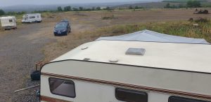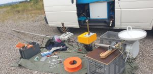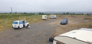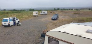 Matthias half auch da fleißig mit, blöde Kommentare gab es von allen zur Genüge. Nach einiges an Wickelarbeit war dann auch endlich das Seil und schlussendlich auch die Plane ab. Schnell alles eingeräumt und dann haben wir uns auch endlich auf zum Contetsberg gemacht. Der Buli hat sich gut fahren lassen, eigentlich wie immer. Sobald der Motor einmal angeworfen war, läuft er gut. Endlich oben angekommen, fuhr ich zwei bis dreimal auf die Keile, bis ich mich entschied, beide an der rechten Seite zu setzen, damit der Buli möglichst gerade stand. Tani gab Ihr Okay. Dann räumten wir noch schnell alles unnötige raus und schoben es unter den Buli (Leitern, Sonnenschirm, etc.), dann holte ich Strom, da Hardy dank Solarzellen nun keine Kabeltrommel mehr hatte, musste ich bis direkt ans OV-Vorzelt ein Kabel ziehen, was auch genau nicht passte, aber durch eine überflüssige Kabeltrommel vom OV kompensiert werden konnte. Im Übrigen, für den gesamten Contest wurde eines meiner O² Daten-SIM-Karten genutzt, was sogar gut funktionierte. Alles in allem hat der OV gerade mal 4,58 GB Datenvolumen verbraucht, nicht so viel, wenn man bedenkt, dass ich 60 GB habe und davon meist gerade mal weniger als 1-2 GB verbrauche.