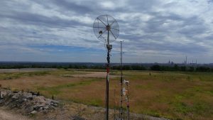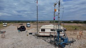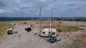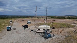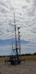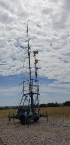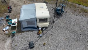 Alle fuhren hoch und ich blieb unten mit dem Schlüssel, um auf Mario zu warten, der hoffentlich auch unterwegs war. Das Tor hatte im Gegensatz zum Maicontest, wo wir es per Hand und viel Kraft aufschieben mussten, wieder elektrisch funktioniert. Keine Viertelstunde später kam auch Mario, den ich hereinließ. Ich wartete noch ein wenig, ob Bernhardt kommt und fuhr dann fünf Minuten später auch hoch, nachdem ich das Tor zugemacht habe. Oben sah alles ziemlich unverändert aus. Das Wetter war gut, sonnig und warm, mit ein paar Wolken. Wir bauten alles wie gehabt auf, einen SM-17 Mast, den Mastwagen inklusiver der dran gesetzter GHZ-Schüsseln vom GHZ-Ralf, sowie den Wohnwagen und das Vorzelt. Zwischendurch fand ich mal die Zeit, ein Video und ein paar Fotos mit der DJI NEO Drohne zu machen.