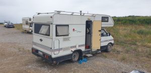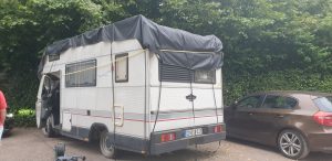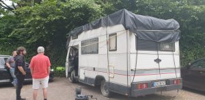 Ich war morgens erstmal ohne Tani alleine mit dem BMW da, Tani konnte sich derweil ein wenig um den Haushalt kümmern und ganz gut ging es Ihr auch nicht. Zwischendurch rief Sie mich auch an, dass Sie von einer kleinen Spinne mit Eiernest angegriffen wurde. Als allmählich alles Gestalt annahm und das Meiste aufgebaut war, fuhr ich runter und zurück zu Tani, da der Matthias gerade am Tor ankam. Nur den Kurbelmast habe ich nicht mit aufgebaut. Daheim angekommen traf ich Tani gerade nach dem Duschen und beim Haareföhnen an. Ich packte schonmal alles, was wir mitnehmen wollten ins Auto (Bettsachen, Trinken, Kärchersauger, etc.). Dann aßen wir eine Kleinigkeit bei Mc-Donalds (ich ein Wrap) und fuhren im nebenstehenden EDEKA einkaufen. Dann gings nochmals kurz nach Hause, da wir Bettlaken vergaßen und konnten somit auch gekühlten Belag kaufen, den wir eben hochbrachten. Dan fuhren wir zum Buli und das Abenteuer Buli-starten begann. Es fing wie erwartet an: Beim Startversuch bewegte sich rein gar nichts, die Fahrzeugbatterie war tot. Ich versuchte es mit Startspray aufgrund der kaputten Glühkerzen, sowie meiner Powerbank. Leider war auch dies ohne Erfolg. Ich versuchte es mit der Powerbank, bis diese dann schlichtweg abschaltete und nicht mehr an ging. Mir blieb somit nichts anderes übrig, als mal den Bernhard anzurufen, der mich auf Matthias verwies. Ich rief Matthias an, der ehe gerade unten am Tor stand und bat ihn, mal vorbeizukommen.