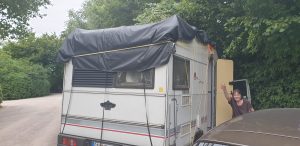 Leider regnete es zu der Zeit dann auch ein wenig. Improvisierte Rettungsversuche mit ein wenig Dekaseal oder Klebeband klappten kaum. Ich suchte weitere Schrauben, da ich das Fenster ehe nur mit einigen und nicht allen befestigt hatte. Als es mehr regnete, stellte Tani im innern Plastikbecher hin, die Sie am Rollo klemmte, wo dann das Wasser, was durch das undichte Fenster kam, auffing. Irgendwann fand ich einige Schrauben und schraubte alles ein wenig besser fest, was das Fenster tatsächlich auch dichter machte. Der Abbau ging mal wieder recht gut und fix. Leider haben wir im nassen mit ein wenig Regen abgebaut. Kurz vor dem Ende des Abbaus kam auch Matthias direkt mit seinem Wagen zu mir, um schonmal Starthilfe zu geben. Zusammen mit dem Startspray klappte dies diesmal sehr gut. Wir einigten uns, dass ich nicht mit zum Anhänger wegbringen komme, sondern wegen meiner Fahrzeugproblematik direkt heim fahre. Wir fuhren den Buli also zu meinen Eltern und gingen dann auch ein wenig zu Besuch zu denen.