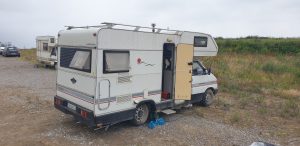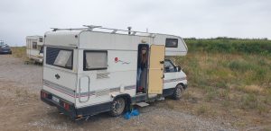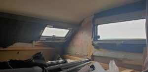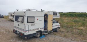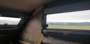 Wir frühstückten unsere üblichen Hotdogs. Zwischendurch kam auch mal Hardy, mit dem ich geredet habe, die Baustelle im Alkoven zeigte und mit dem ich auch den Motor wegen der Batterie anschaute. Wir haben auch zwischen Motorhaube und Frontscheibe mit dem Kärcher Akkusauger mal alles an Blätter und Co weggemacht. Dann habe ich versucht, das große Rollo zu reparieren, indem ich den inneren Rahmen abgeschraubt habe und versuchte, die Feder etwas mehr auf Spannung zu bringen, damit das Rollo wieder vernünftig hoch und runterging. Ergebnis war leider, dass mir fast das Fenster von außen rausgefallen wäre, die obere linke Ecke (von außen gesehen) war komplett vom Buli getrennt und klebte nicht mehr.