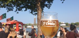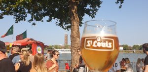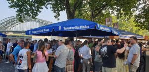Aber wir haben spontan am Theater am Rhein ein anderes Parkhaus gesehen, was wir dann anfuhren und in dem wir, obwohl es voll war, glücklicherweise direkt einen Parkplatz in einer obereren Etage bekamen (da fuhr gerade einer weg), schön an einer Wand und schön breit. Das Beste an dem Parkhaus: Direkt auf der anderen Straßenseite war auch schon das Bierfest am Rhein. Wir gingen also zu Fuß dorthin und schlenderten einmal rüber. Das erste Bier nahm sich Tani am Stand mit dem Mango-Bier, derselbe Stand, wie auf der Bierbörse in Mülheim an der Ruhr eine Woche zuvor, allerdings war das Mango-Bier diesmal noch nicht ausverkauft. Am Stand stand auch einer, der sehr ähnlich dem Komiker Markus Krebs aussah. Nach dem Mango-Bier gingen wir weiter bis zum Ende, wo sich Tani noch ein großes Kirschbier gönnte.