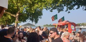 Wir gingen bis zum anderen Ende, wo es zwischendurch mal einen richtigen Engpass gab, da dort an einem Steg viele Leute warteten, um auf ein Schiff draufzukommen. Dahinter war aber auch nicht mehr so viel und wir gingen wieder zurück. An einem Grillstand entschied sich Tani für eine gegrillte Mettwurst im Brötchen, wovon ich auch probierte. Während wir da standen und Tani Ihr Wurstbrötchen aß, sah ich rechts, schräg gegenüber ein Pommesstand, an dem ich eben hinging und mir eine normale Portion Pommes mit Mayo holte, während hinter mir welche etwas nervig betrunken laut redeten. Ich bekam auf Anfrage auch ein zweiten Holzpicker von der Frau, die lächelte, als ich nach einem für meine Freundin fragte. So aß ich meine Pommes und Tani Ihr Wurstbrötchen zu Ende. Dann pickte Tani auch noch ein paar meiner Pommes mit.