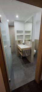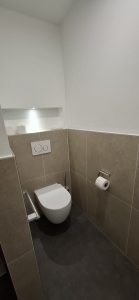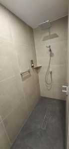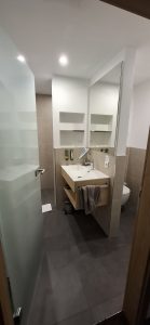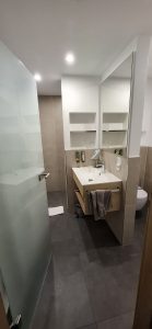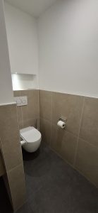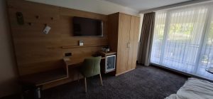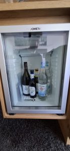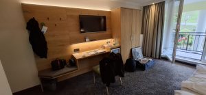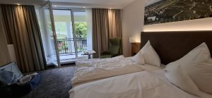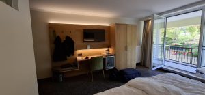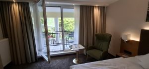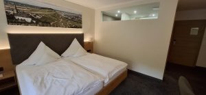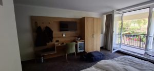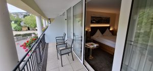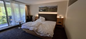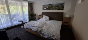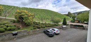 Wir hatten im Wesentlichen einen großen Koffer sowie einen Rucksack. Die Getränke, die wir zuvor bei EDEKA in Mülheim an der Ruhr kauften, verstaute ich im Koffer und brachte auch alles auf einmal hoch, bevor ich zweimal laufe. Anstatt dem Fahrstuhl nahm ich die Treppe, da wir im erstem Stock direkt waren. Das Hotelzimmer war sehr schön und modern. Viel Ambientebeleuchtung und eine schöne Aussicht direkt auf die Weinfelder. Die Dusche war sehr groß, nur das Oberlicht vom Schlafraum zum Badezimmer hin sowie eine nicht abschließbare Milchglastür Tür im Bad war gewöhnungsbedürftig. Eine Minibar garb es ebenfalls mit wie es sich für ein Weingut gehört natürlich einer Flasche Wein.