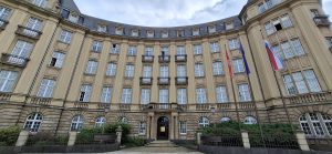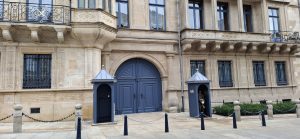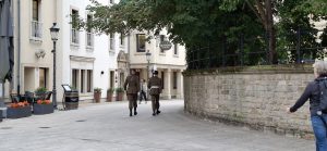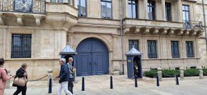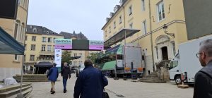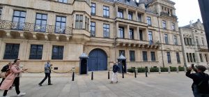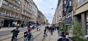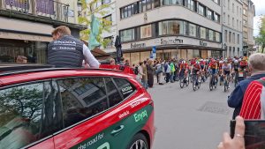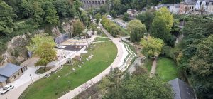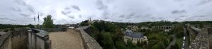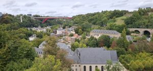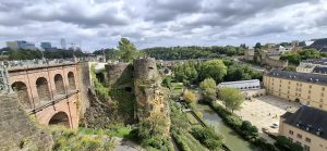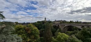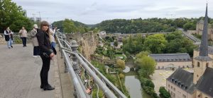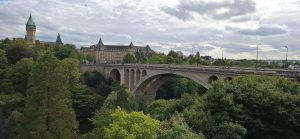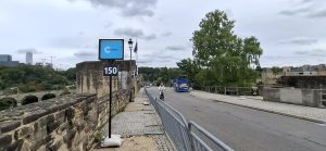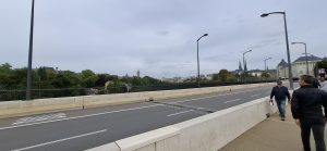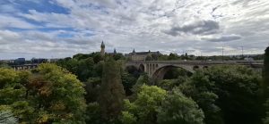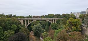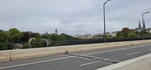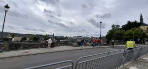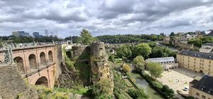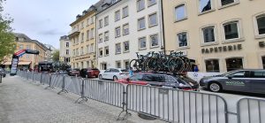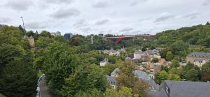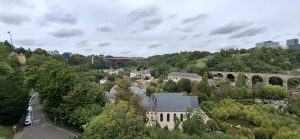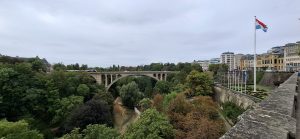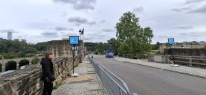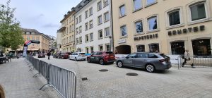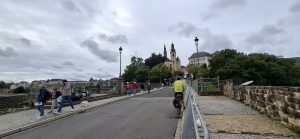 Wir gingen rein und schauten uns da alles ein wenig an. Von dort gingen wir dann weiter unseren Wegdurch Luxemburg. Wir gingen teilweise ein wenig Planlos durch die Straßen, hatten aber auch genug zu sehen. Irgendwann gingen wir auf einer Brücke für Fußgänger und Fahrradfahrer, die unter einer Brücke hing, bei der mir ein wenig Mulmig wurde. Als wir wieder in der Stadt auskamen, gingen wir da ein wenig durch. Zwischendurch gab es doch recht viele sehr hochpreisige Uhrengeschäfte und ähnliches. An einer Straße in der Stadt standen dann eine menge Leute an der Straße einfach so, ohne diese zu überquären und Aufpasser, die versuchten, alles im Blick zu behalten. Irgendwann verboten die Aufpasser dann, die Straße zu überquären und einige Motorräder, Autos und Poilzeimotorräder fuhren langsam durch für die Vorbereitung des Starts der Tour de Luxemburg. Ein Polizeimotorrad stand da und ein Fußgänger versuchte über die Straße zu gehen und wurde ganz schell vom Polizisten zurückgepfiffen.