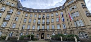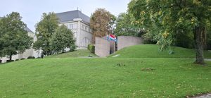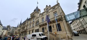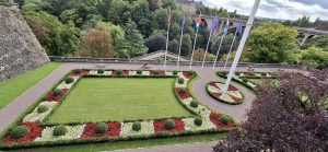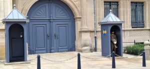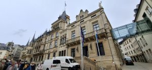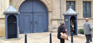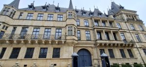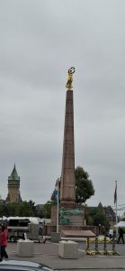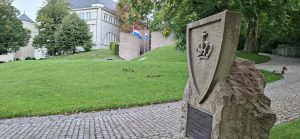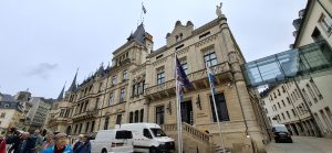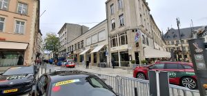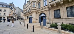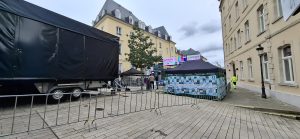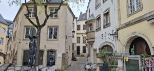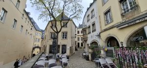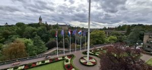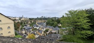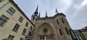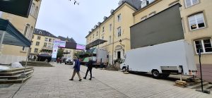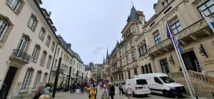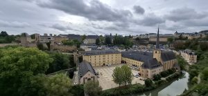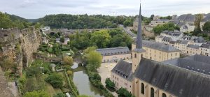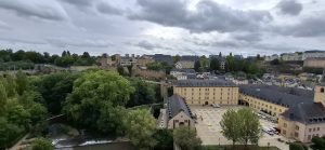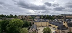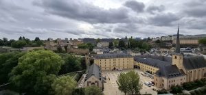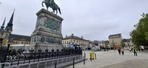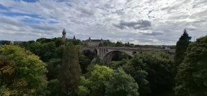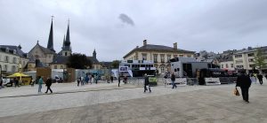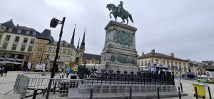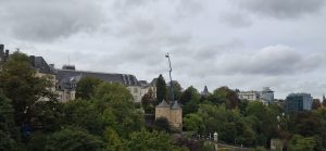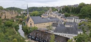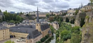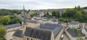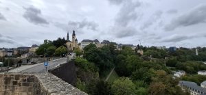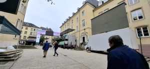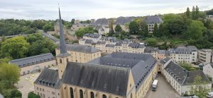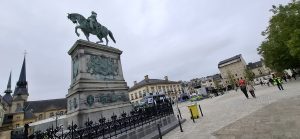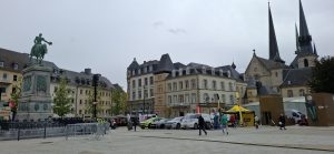 Eigentlich wollten wir weiter den Randweg durch die alten Maueranlagen gehen, kamen aber ein wenig vom Pfad ab und über den Marktplatz dann ehe in etwas modernere Teile der Stadt. Auf einem weiterem kleinen Marktplatz über die Straße, auf dem gerade auch ein Markt war, stand eine Statue sowie eine sehr große Luxemburgianische Flagge. Wir gingen da einmal rum und dann zurück zur anderen Straßenseite, an dem eine große Kirche stand, die wir besichtigten.