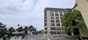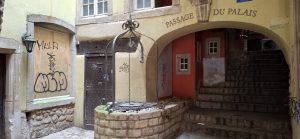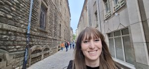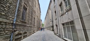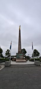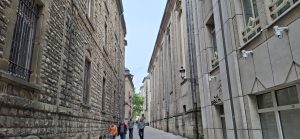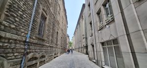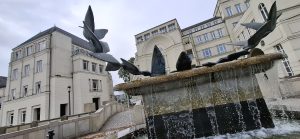 Man verließ den dreckigen Teil der Stadt und gelangte in den schöneren, moderneren Teil. Von da auf waren wir wiederrum schnell über eine Brücke und vorbei an einem Kriegsdenkmal, wo ein echtes Ethanolfeuer scheinbar dauerhaft brennt in der schönen Altstadt, an einer Bücherei, von wo man aus nach unten in den schönen, altstädtischen Teil reinschauen konnte. Dort, an dem Brunnen, an dem wir standen, stand auch das bekannte Gebäude, mit den großen, bunten Vasen drum herum.