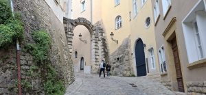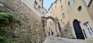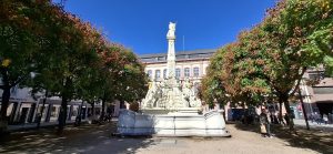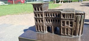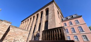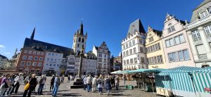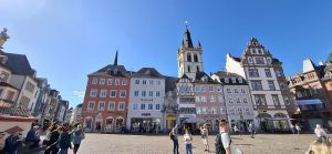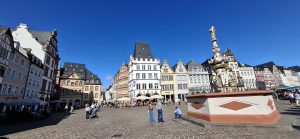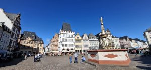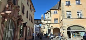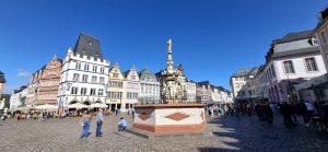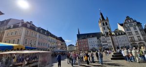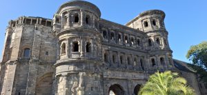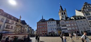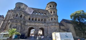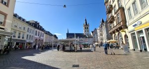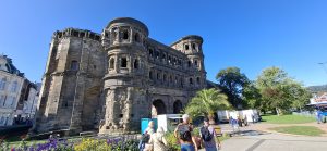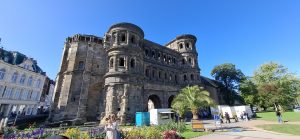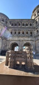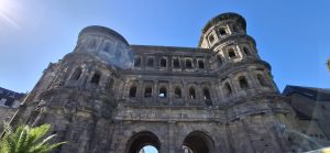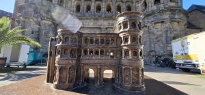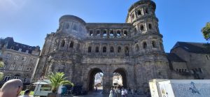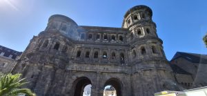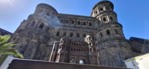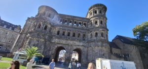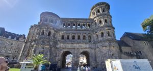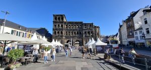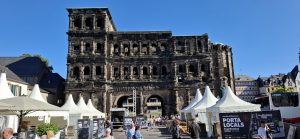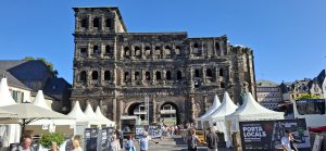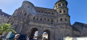 Eines der ersten Läden, an denen wir vorbei gingen, wer hätte es gedacht, waren Weingeschäfte. Wir kamen relativ direk auf dem Marktplatz von Trier aus, in dessen Nähe auch das römische Tor namens Porta Nigra stand. Wir gingen zuerst zur Porta Nigra , an dem wir ein paar Fotos machten und uns ein wenig umsahen. Lustig, dass das Tor von den Römern stabiel und gut gebaut wurde und einige Flickarbeiten der Neuzeit da aussahen, als wüsste man nicht, was man täte. Dort am Tor wurde auch gerade ein Streetfoodfest aufgebaut, allerdings erst fürs kommende Wochenende. Das Betreten des Tores von innen kostete Eintritt, was sich, da wir nur eine STudne Parkzeit hatten natürlich nicht lohnte. Wir gingen somit dann wieder zurück zum Marktplatz, vorbei an einem Schuhladen, der genau meine Schuhe in Kartons vor der Tür hatten. Ich schaute in den Karton, in dem nur ein Schuh war. Das Ausstellungsstück oben, war aber eine andere Größe, also fehlte der Andere. Im Glauben, dass er geklaut wurde, gingen wir rein und fragten nach. Die Verkäuferin erklärte uns, dass Sie immer nur einen Schuh im Karton hat, eben damit der Karton nicht geklaut wird. Also gingen wir raus ud wollten den Karton holen und da war der dann weg, genau der in meiner Größe… Unser Glück mal wieder.