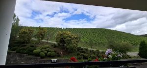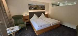 Wir hatten im Wesentlichen einen großen Koffer sowie einen Rucksack. Die Getränke, die wir zuvor bei EDEKA in Mülheim an der Ruhr kauften, verstaute ich im Koffer und brachte auch alles auf einmal hoch, bevor ich zweimal laufe. Anstatt dem Fahrstuhl nahm ich die Treppe, da wir im erstem Stock direkt waren. Das Hotelzimmer war sehr schön und modern. Viel Ambientebeleuchtung und eine schöne Aussicht direkt auf die Weinfelder. Die Dusche war sehr groß, nur das Oberlicht vom Schlafraum zum Badezimmer hin sowie eine nicht abschließbare Milchglastür Tür im Bad war gewöhnungsbedürftig. Eine Minibar garb es ebenfalls mit wie es sich für ein Weingut gehört natürlich einer Flasche Wein.