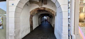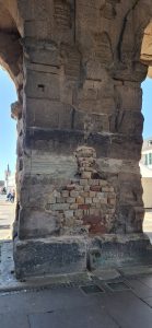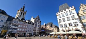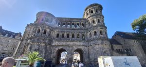 Eines der ersten Läden, an denen wir vorbei gingen, wer hätte es gedacht, waren Weingeschäfte. Wir kamen relativ direk auf dem Marktplatz von Trier aus, in dessen Nähe auch das römische Tor namens Porta Nigra stand. Wir gingen zuerst zur Porta Nigra , an dem wir ein paar Fotos machten und uns ein wenig umsahen. Lustig, dass das Tor von den Römern stabiel und gut gebaut wurde und einige Flickarbeiten der Neuzeit da aussahen, als wüsste man nicht, was man täte. Dort am Tor wurde auch gerade ein Streetfoodfest aufgebaut, allerdings erst fürs kommende Wochenende. Das Betreten des Tores von innen kostete Eintritt, was sich, da wir nur eine STudne Parkzeit hatten natürlich nicht lohnte. Wir gingen somit dann wieder zurück zum Marktplatz, vorbei an einem Schuhladen, der genau meine Schuhe in Kartons vor der Tür hatten. Ich schaute in den Karton, in dem nur ein Schuh war. Das Ausstellungsstück oben, war aber eine andere Größe, also fehlte der Andere. Im Glauben, dass er geklaut wurde, gingen wir rein und fragten nach. Die Verkäuferin erklärte uns, dass Sie immer nur einen Schuh im Karton hat, eben damit der Karton nicht geklaut wird. Also gingen wir raus ud wollten den Karton holen und da war der dann weg, genau der in meiner Größe… Unser Glück mal wieder.