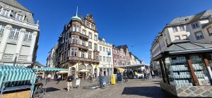 Also gingen wir noch ein wenig die Straße runter, durch den Marktplatz, auf dem ein Weinstand stand. Am Ende einer Straße kamen wir an einem Katzenkaffee vorbei, einem Kaffee, wo wirklich einfach Katzen rumlaufen, mit extra zwei Türen, damit diese nicht abhauten. An einem Musikladen, an dem ich kurz ins Schaufenster schaute, der überraschend viele Gitarren hatte, blieben wir auch kurz stehen, bevor wir dann zurück gingen. Über einen anderen Weg kamen wir an einen Straßenmusiker vorbei, der ein seltsames Instrument hatte, was ich bis dato nicht nicht so gesehen habe. Das Instrument war ein Handpan, was meine Recherchen nun gezeigt haben. Das Instrument stand übrigens auch im besagtem Musikladen im Schaufenster. Eine Frau hat dem Straßenmusiker übrigens zugehört und Fragen gestellt, woher dieses Instrument kommt usw. Wir gingen weiter an einem Brunnen vorbei wo ein Bitburger-Brauhaus war. Weiter hinten sah ich die bekannte evangelische Kirche, für die wir wegen dem Parkticket aber keine Zeit hatten. Wir gingen zurück zum Auto und suchten diesmal mit meinem Handy ein Parkhaus (Tanis Handy hat irgendwie keine Parkhäuser mehr angezeigt). Wir fanden ein gut und günstiges, was für ein Einkaufsladen bestimmt war. Wir fuhren dorthin und stellten uns auf einem gefundenen Parkplatz ab. Dann gings zu Fuß wieder zur Stadt. Anderer Weg, anderes zu sehen,