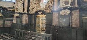 Darunter ein Grab, was ein Karitas-Logo drauf hatte. Ich schaute hier uns da in die uralten Schlüssellöcher der Türen an den Wänden, in der Hoffnung noch was historisch interessantes zu sehen, leider waren es hauptsächlich leere Räume oder Räume mit einfach Möbel drinnen. An den Wänden draußen war auch die Geschichte des Doms, vom ersten Bau, bis heute, sowie die Geschichte des Kleides Jesu, was dort war.