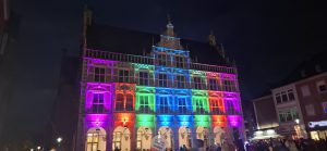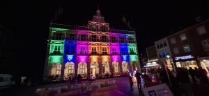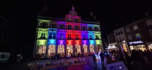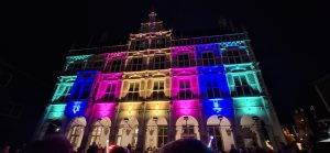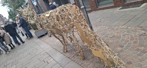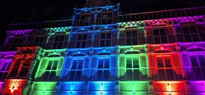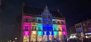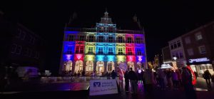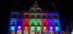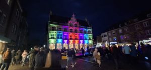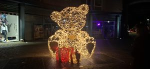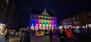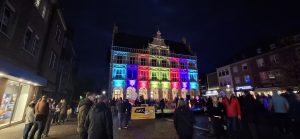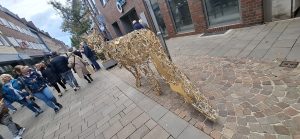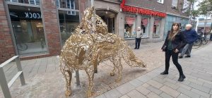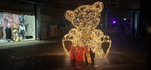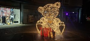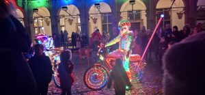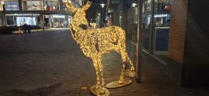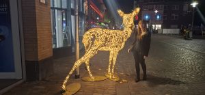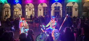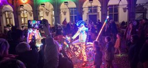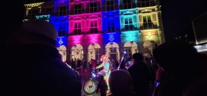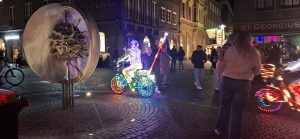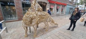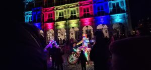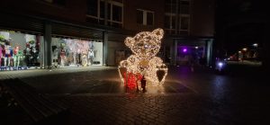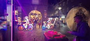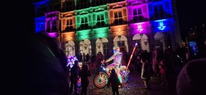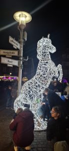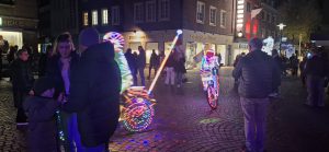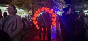 Eine Minibühne mit einem Typ, der ein wenig mit Feuerfackeln jonglierte und ein wenig Beleuchtung am Rathaus. Dazu waren wie bereits erwähnt in der ganzen Stadt Skulpturen von Tieren beleuchtet verteilt. Wir gingen durch alle interessanten Straßen und auch mal in ein Schuhladen rein.