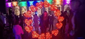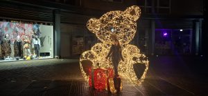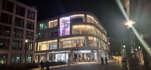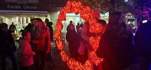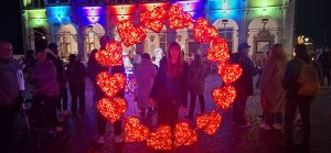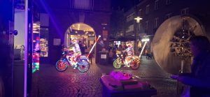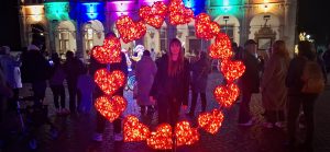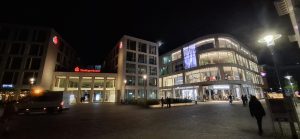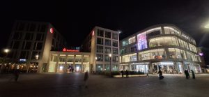 Dann gings wie üblich nach Peek & Cloppenburg, wo sich Tani ein Oberteil kaufte. Als es dann draußen dunkel wurde, kamen wir gerade rechtzeitig zum „Höhepunkt“ der Veranstaltung auf dem Marktplatz an. Ehrlich gesagt, hätte man nicht mal bemerkt, dass dort eine Veranstaltung war, hätte dies nicht auf Plakate geschrieben. Da war ein leuchtender Herzkreis, in de man sich fotografieren konnte, sowie zwei Menschen auf, mit LED ausgeleuchtete Fahrräder. Sonst nur noch eine Pommesbude, das war es.