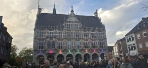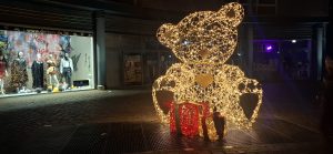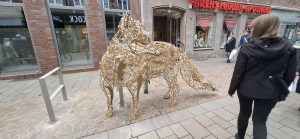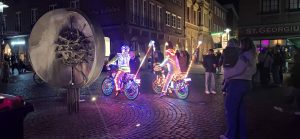 Eine Minibühne mit einem Typ, der ein wenig mit Feuerfackeln jonglierte und ein wenig Beleuchtung am Rathaus. Dazu waren wie bereits erwähnt in der ganzen Stadt Skulpturen von Tieren beleuchtet verteilt. Wir gingen durch alle interessanten Straßen und auch mal in ein Schuhladen rein.