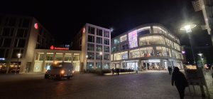 Dann gings wie üblich nach Peek & Cloppenburg, wo sich Tani ein Oberteil kaufte. Als es dann draußen dunkel wurde, kamen wir gerade rechtzeitig zum „Höhepunkt“ der Veranstaltung auf dem Marktplatz an. Ehrlich gesagt, hätte man nicht mal bemerkt, dass dort eine Veranstaltung war, hätte dies nicht auf Plakate geschrieben. Da war ein leuchtender Herzkreis, in de man sich fotografieren konnte, sowie zwei Menschen auf, mit LED ausgeleuchtete Fahrräder. Sonst nur noch eine Pommesbude, das war es.