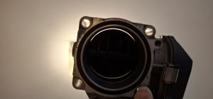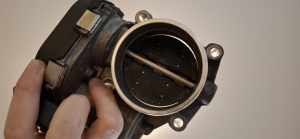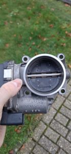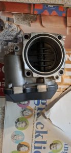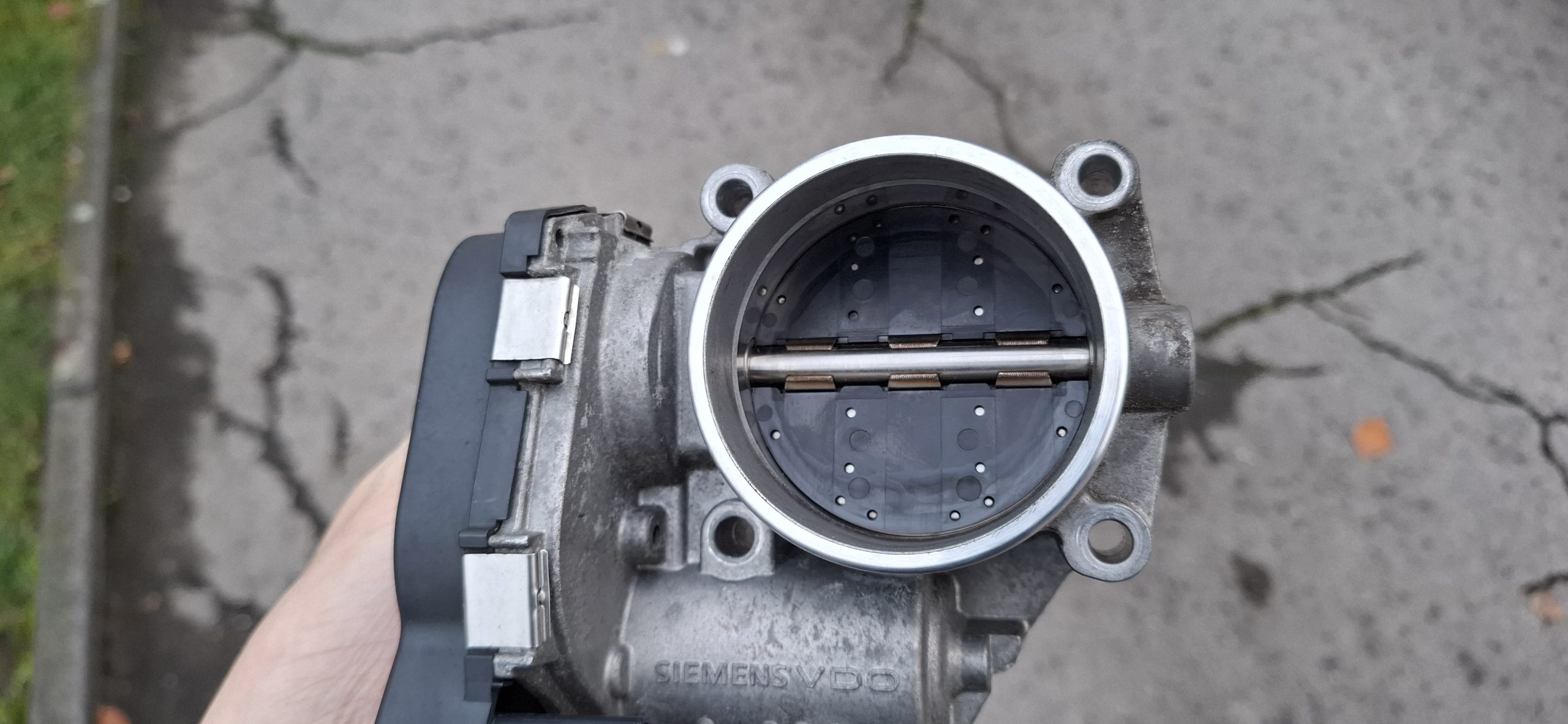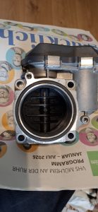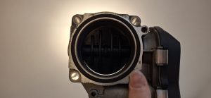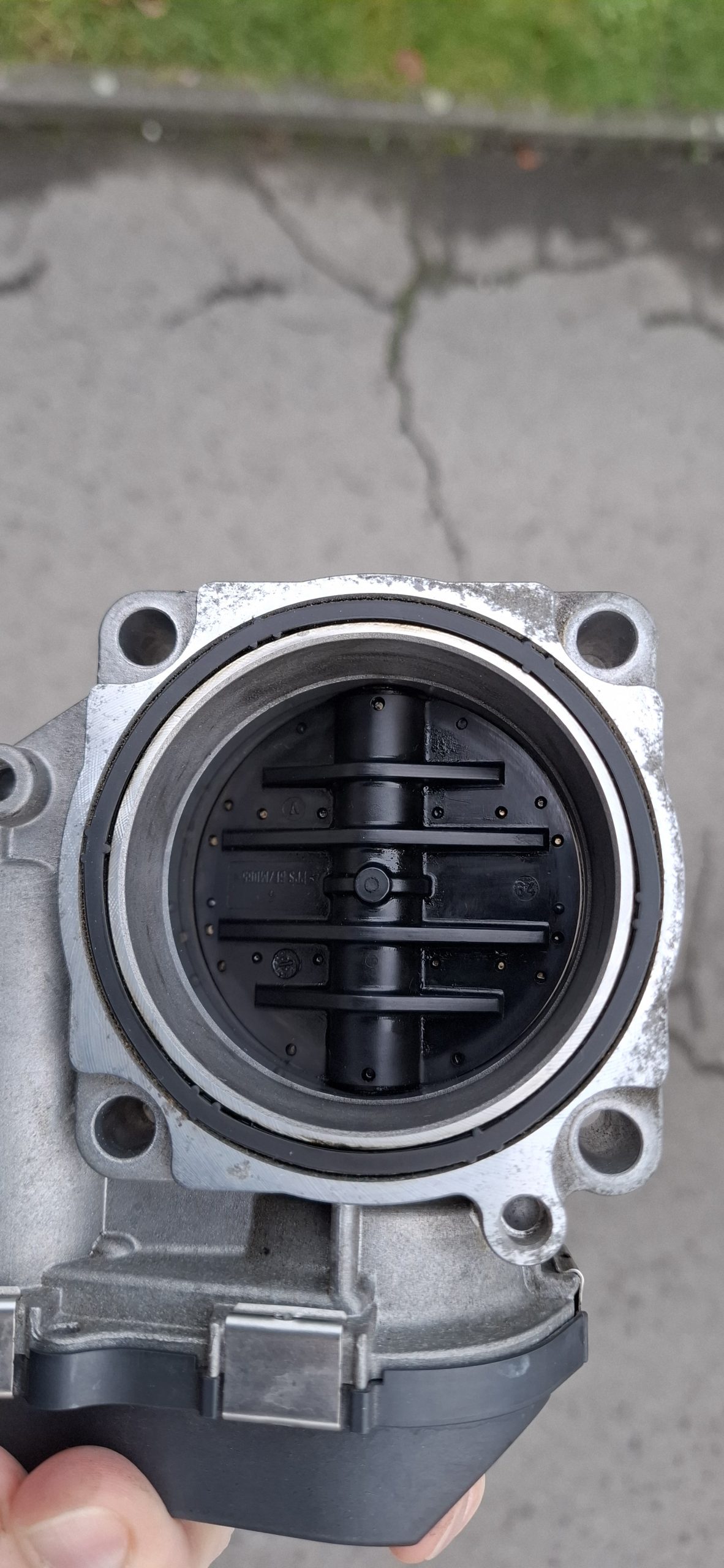 Irgendwann lag die Drosselklappe dann aber frei, die ich an sich einfach mit vier Schrauben lösen konnte. Ich nahm diese mit nach oben in die Wohnung und reinigte sie gründlich mit Drucklustspray und Isopropanol, was ich für den 3D-Drucker habe. Ich habe da ordentlich Dreck herausbekommen, unter anderem mithilfe eines mit Isopropanol befeuchteten Wattestäbchens oder eines Stück Zeitung, welches ich durch die geschlossene Drosselkappe schob. Nachdem ich mit viel Sorgfalt und Mühe alles sauber hatte, lies ich die Drosselklappe noch ein wenig trocknen. Hielt man die Drosselklappe ins Licht, sah man, dass diese trotz geschlossenen Zustands oben und unten leicht durchschimmerte, ob dies normal ist und die sich im Betrieb automatisch korrigiert, kann ich so bisher leider nicht sagen. Nachdem die Drosselklappe wieder trocken war, ging es ans Wiedereinbauen. Ich erledigte also zuerst den einfachen Teil: Die Drosselklappe mit den vier Schrauben an den Motor dran schrauben.