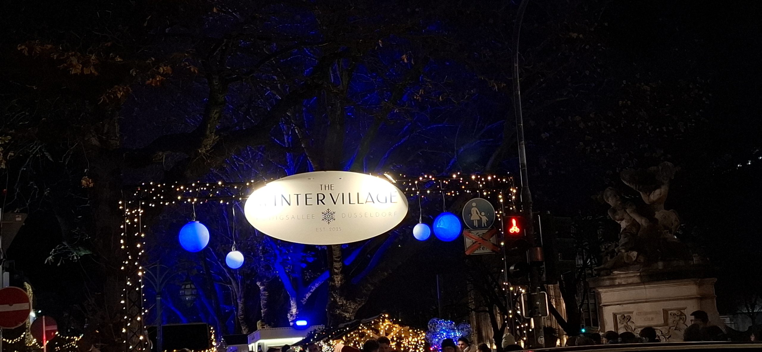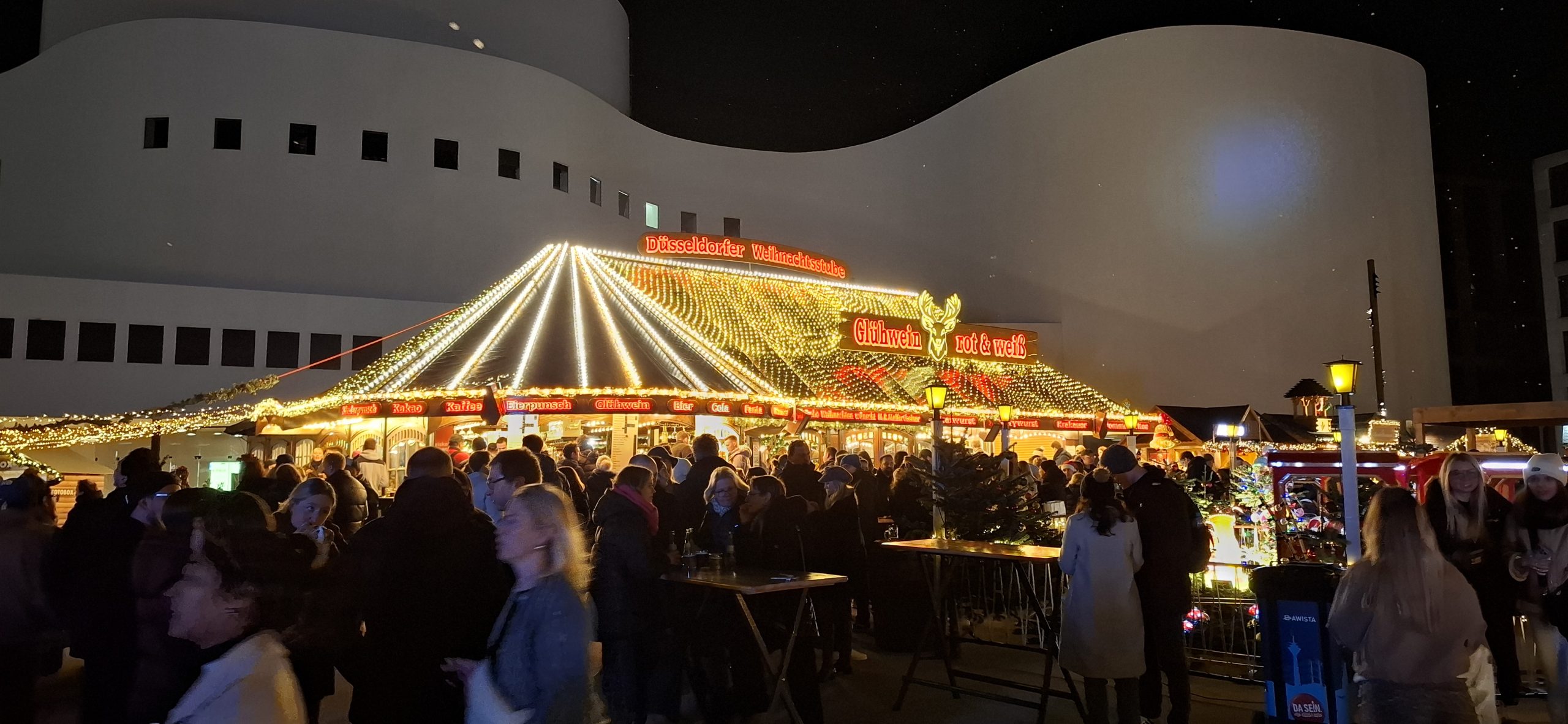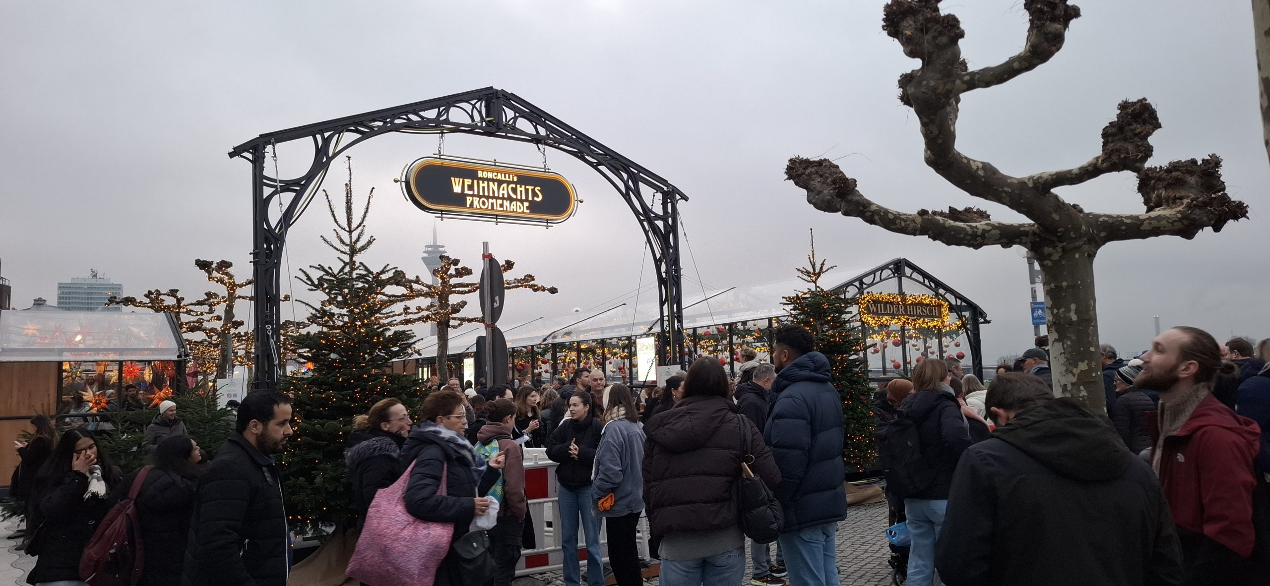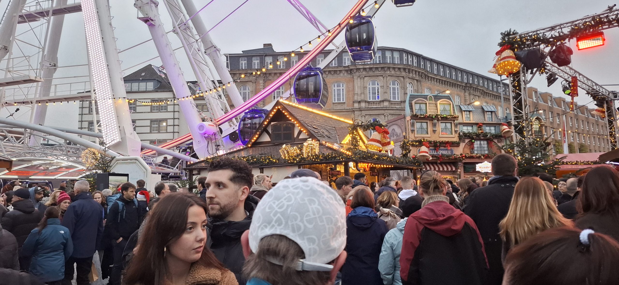 Am Samstag, dem 22. November 2025, fuhren wir nach Düsseldorf. Dies war dieses Jahr unser erster Weihnachtsmarkt. Wir parkten wie immer und haben überraschenderweise relativ direkt einen Parkplatz bekommen. Wir gingen den üblichen Fußmarsch zur und über die Brücke, an der Promenade entlang, vorbei am ersten Weihnachtsmarkt, direkt am Rhein mit dem Riesenrad. Diesmal hat dieser in der Mitte einen runden LED-Kreis mit verschiedenen teils überhaupt nicht lesbaren Werbeeinblendungen gehabt.