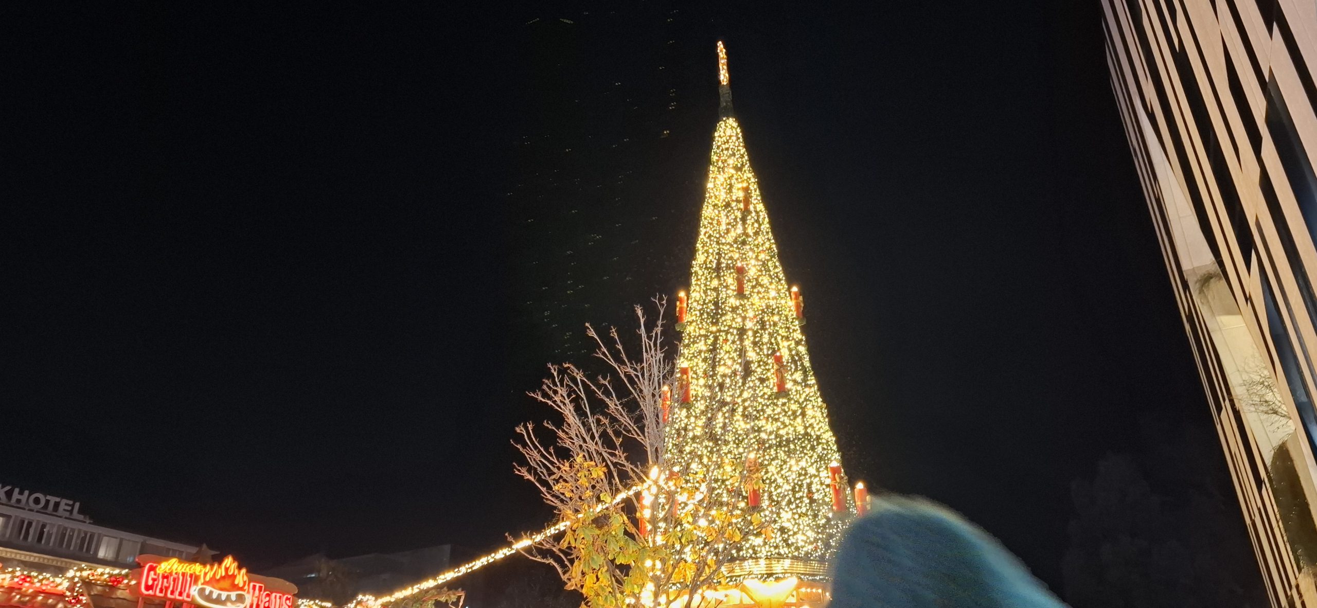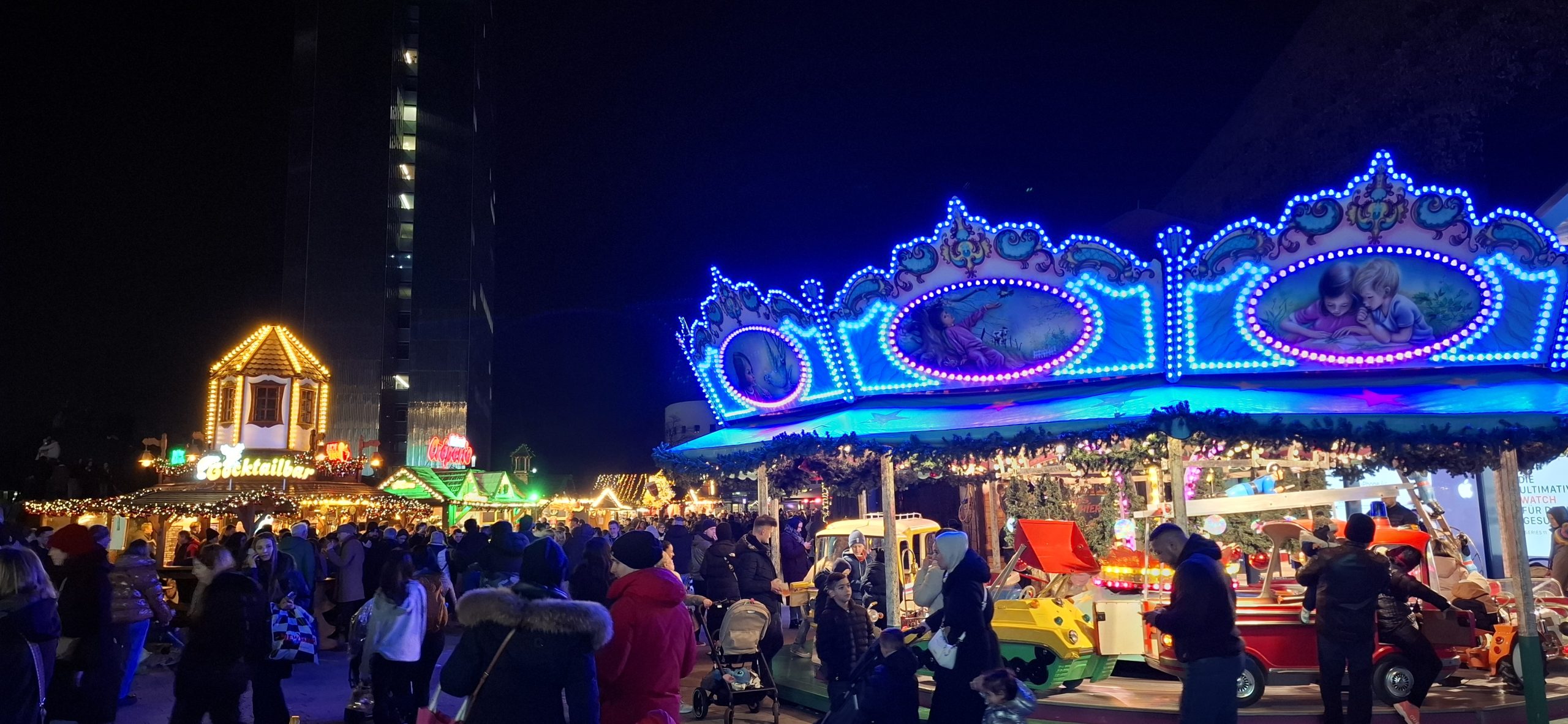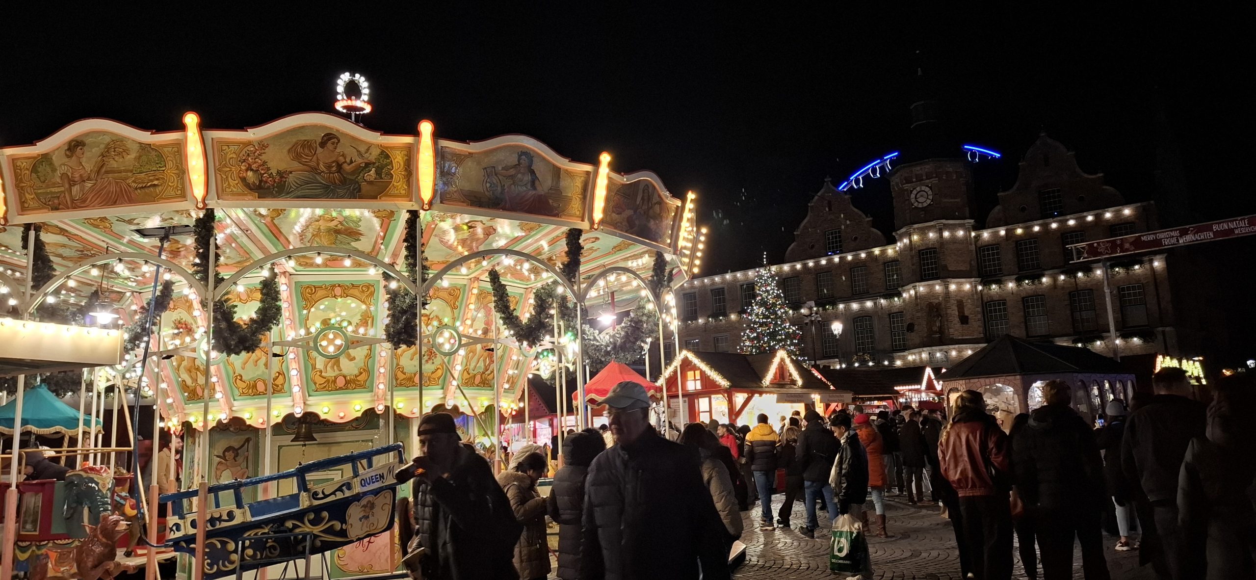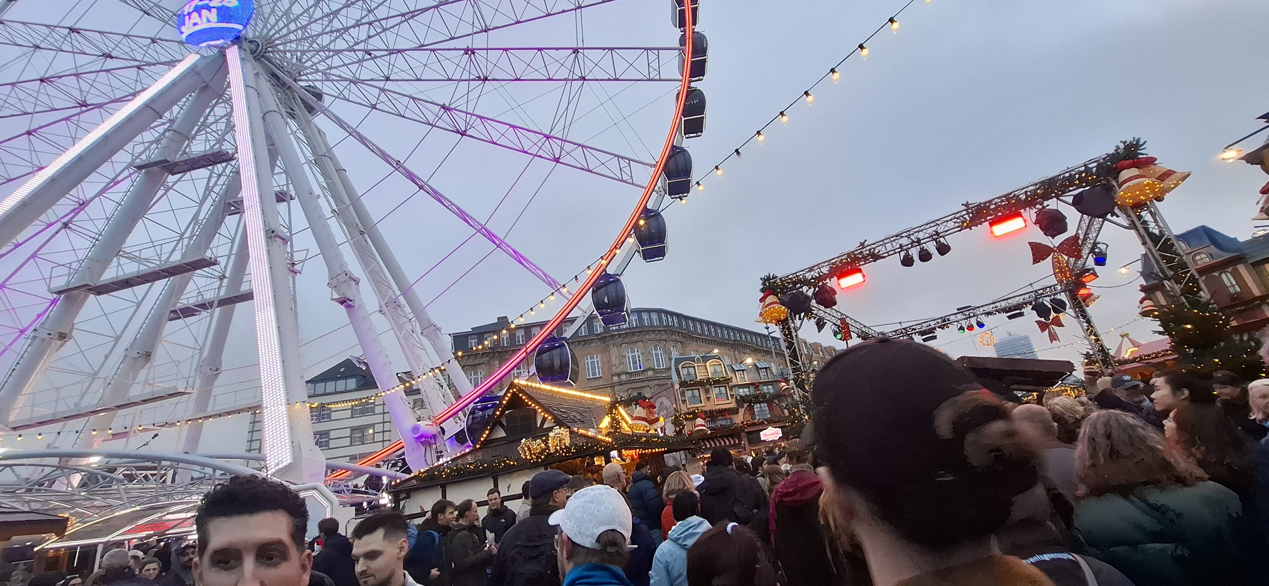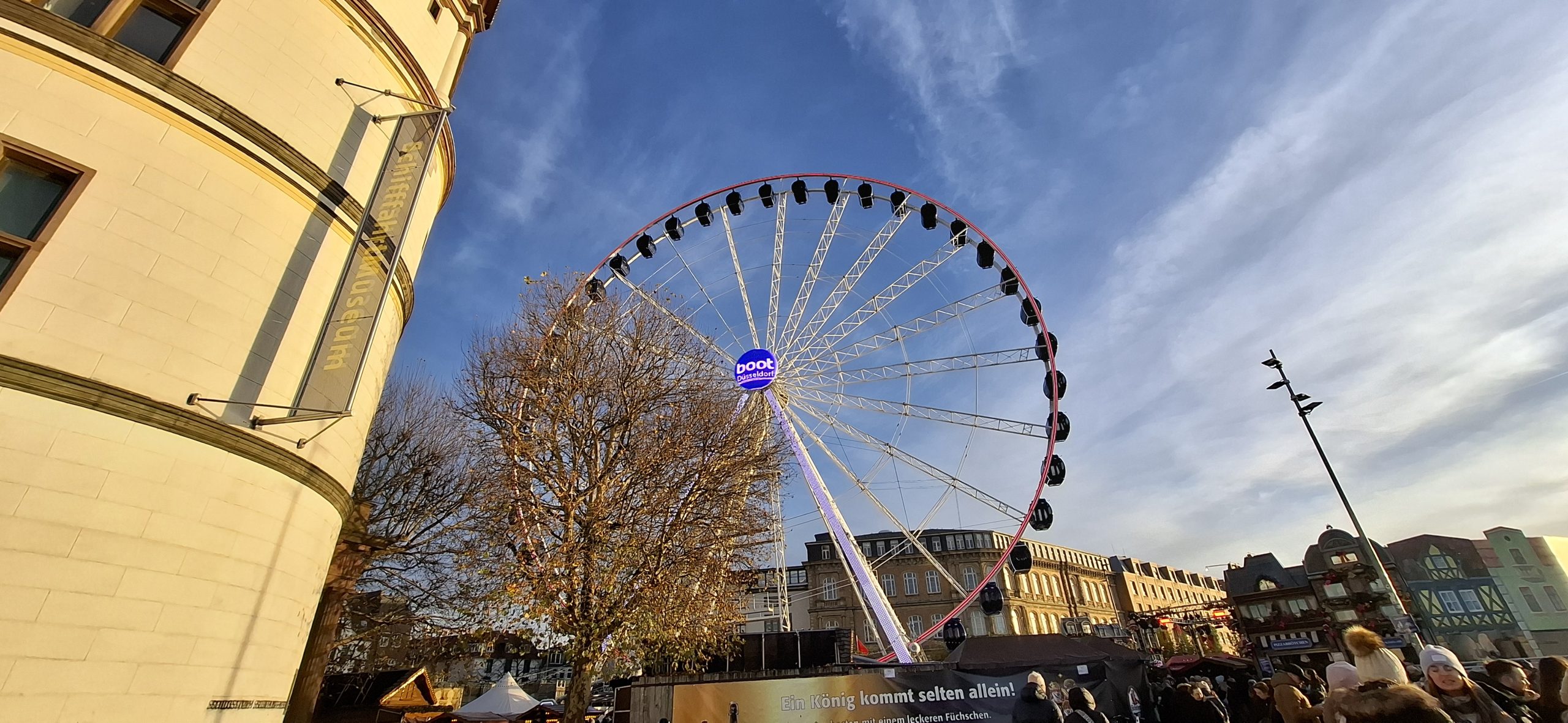 Am Samstag, dem 22. November 2025, fuhren wir nach Düsseldorf. Dies war dieses Jahr unser erster Weihnachtsmarkt. Wir parkten wie immer und haben überraschenderweise relativ direkt einen Parkplatz bekommen. Wir gingen den üblichen Fußmarsch zur und über die Brücke, an der Promenade entlang, vorbei am ersten Weihnachtsmarkt, direkt am Rhein mit dem Riesenrad. Diesmal hat dieser in der Mitte einen runden LED-Kreis mit verschiedenen teils überhaupt nicht lesbaren Werbeeinblendungen gehabt.