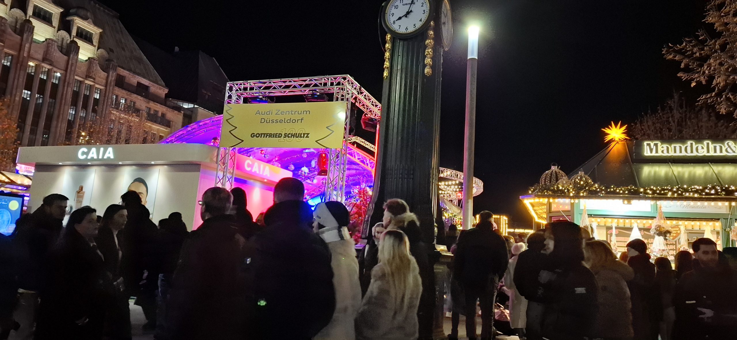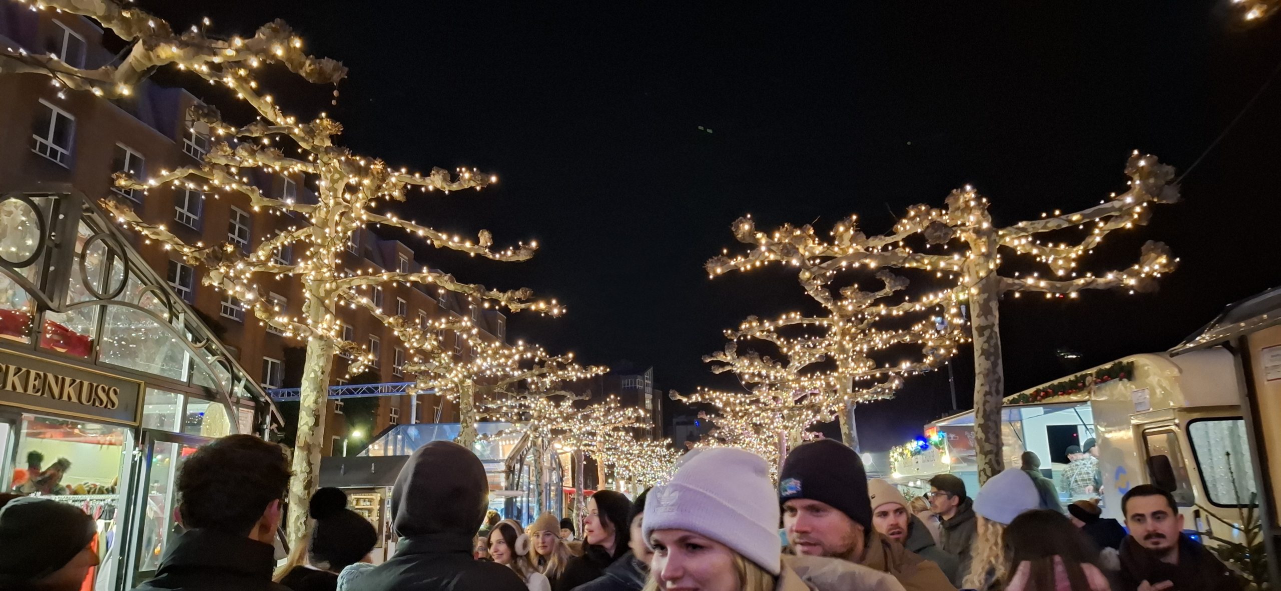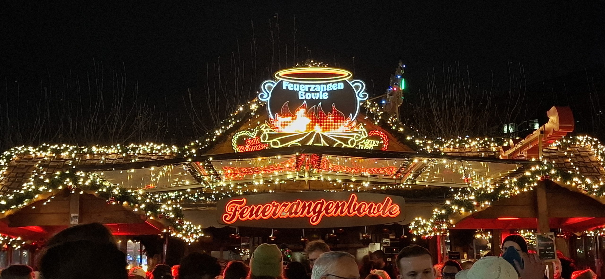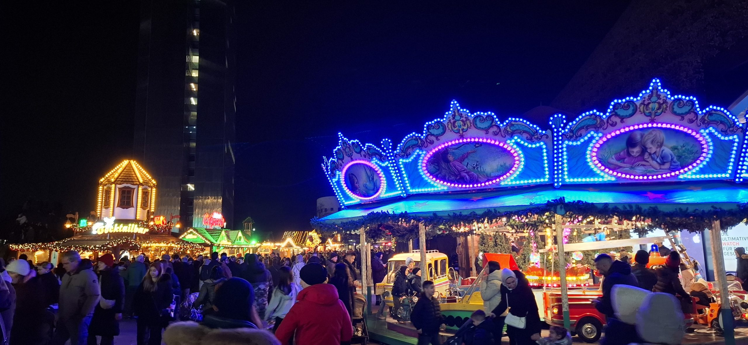 Am Samstag, dem 22. November 2025, fuhren wir nach Düsseldorf. Dies war dieses Jahr unser erster Weihnachtsmarkt. Wir parkten wie immer und haben überraschenderweise relativ direkt einen Parkplatz bekommen. Wir gingen den üblichen Fußmarsch zur und über die Brücke, an der Promenade entlang, vorbei am ersten Weihnachtsmarkt, direkt am Rhein mit dem Riesenrad. Diesmal hat dieser in der Mitte einen runden LED-Kreis mit verschiedenen teils überhaupt nicht lesbaren Werbeeinblendungen gehabt.