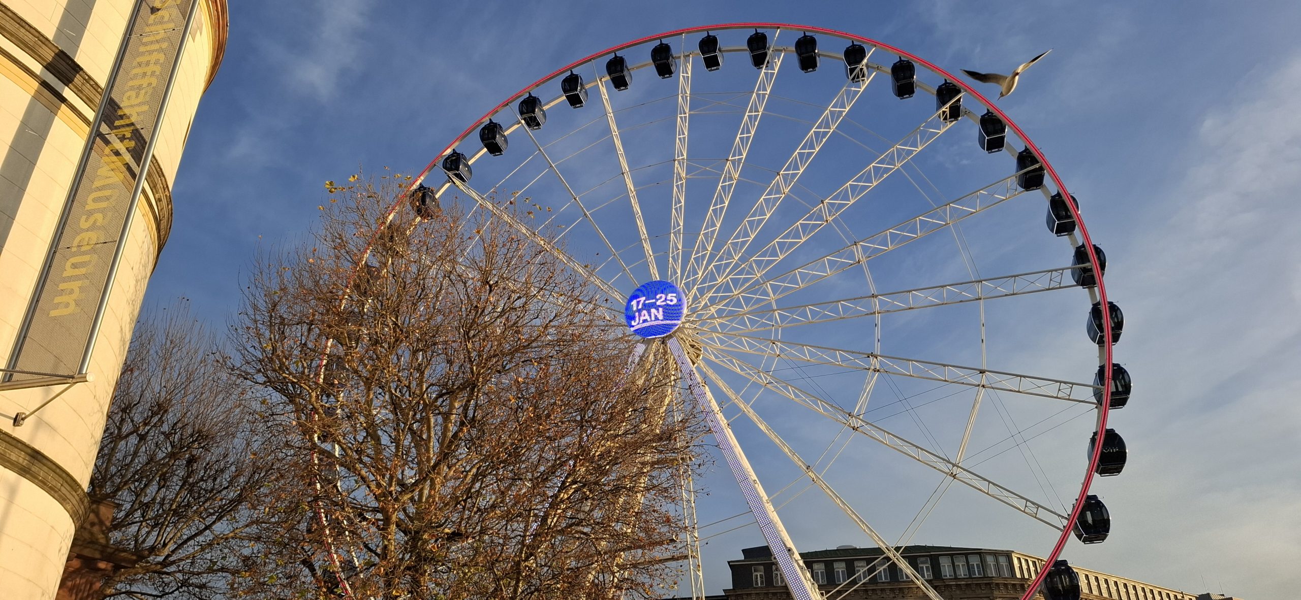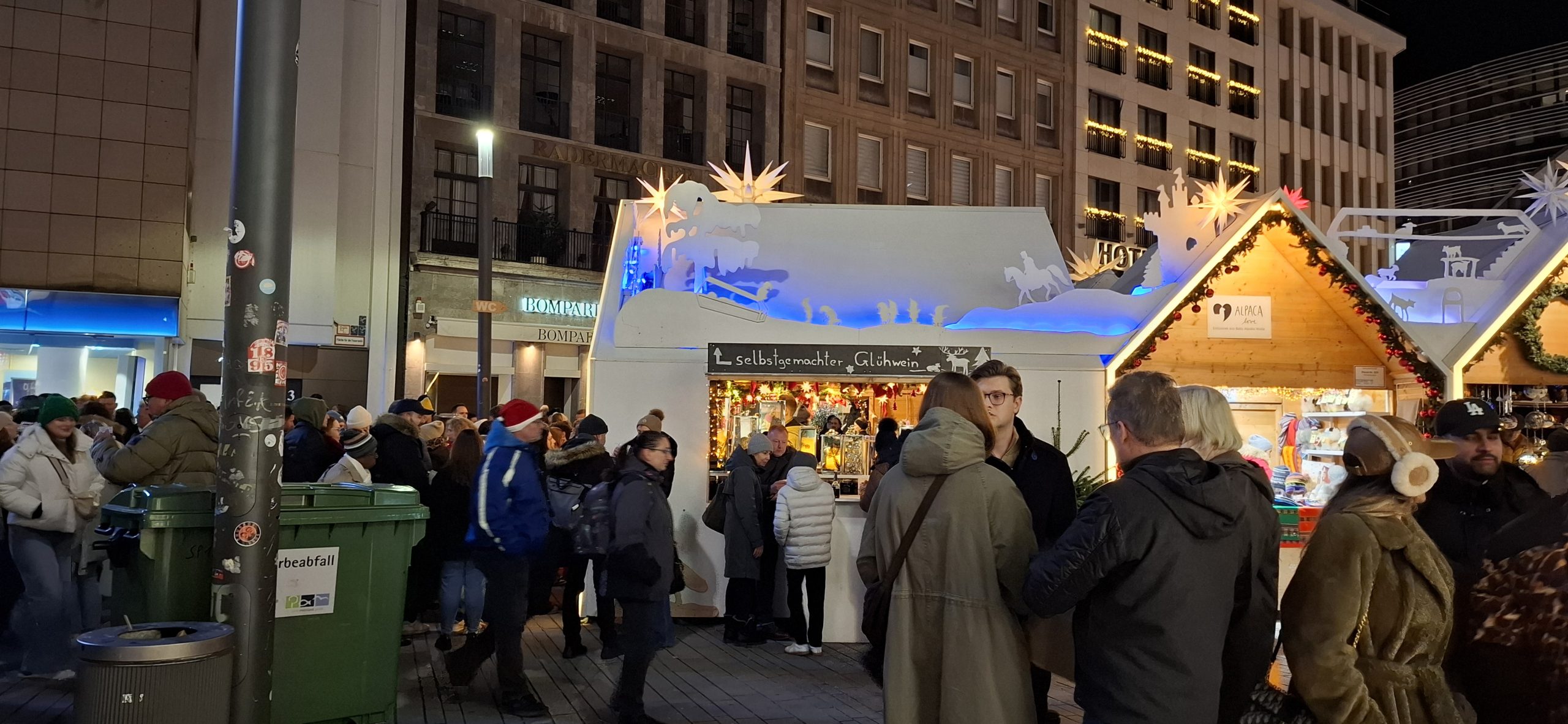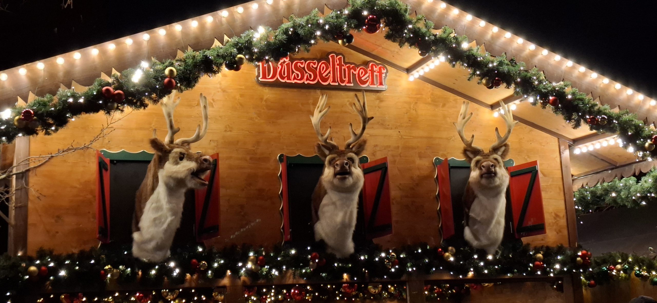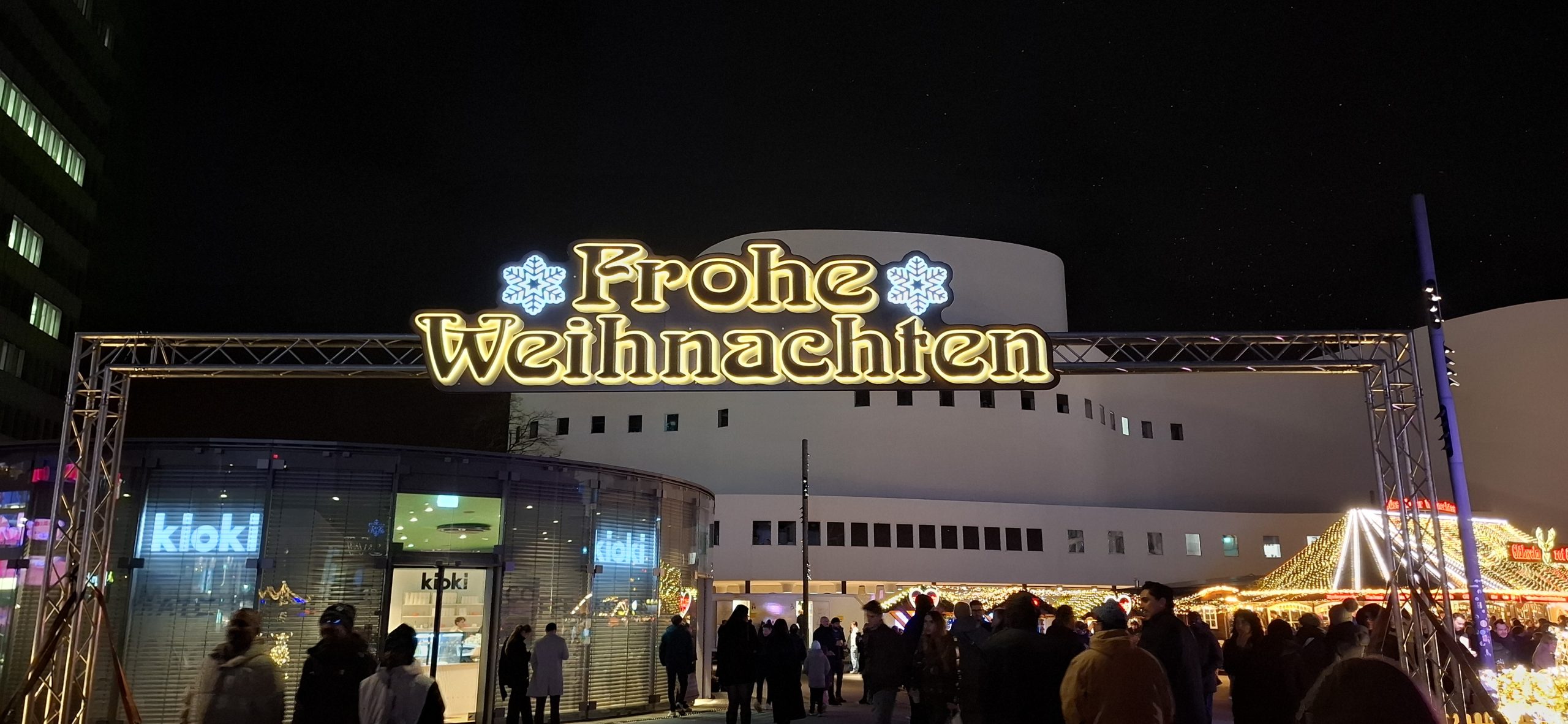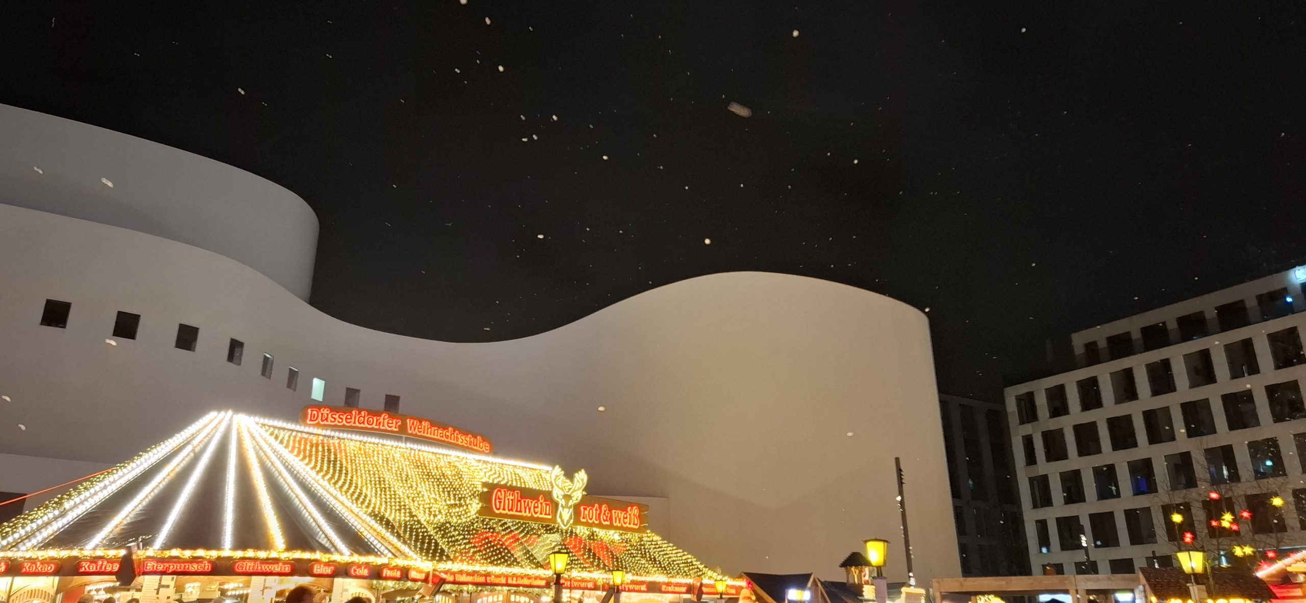 Am Samstag, dem 22. November 2025, fuhren wir nach Düsseldorf. Dies war dieses Jahr unser erster Weihnachtsmarkt. Wir parkten wie immer und haben überraschenderweise relativ direkt einen Parkplatz bekommen. Wir gingen den üblichen Fußmarsch zur und über die Brücke, an der Promenade entlang, vorbei am ersten Weihnachtsmarkt, direkt am Rhein mit dem Riesenrad. Diesmal hat dieser in der Mitte einen runden LED-Kreis mit verschiedenen teils überhaupt nicht lesbaren Werbeeinblendungen gehabt.
