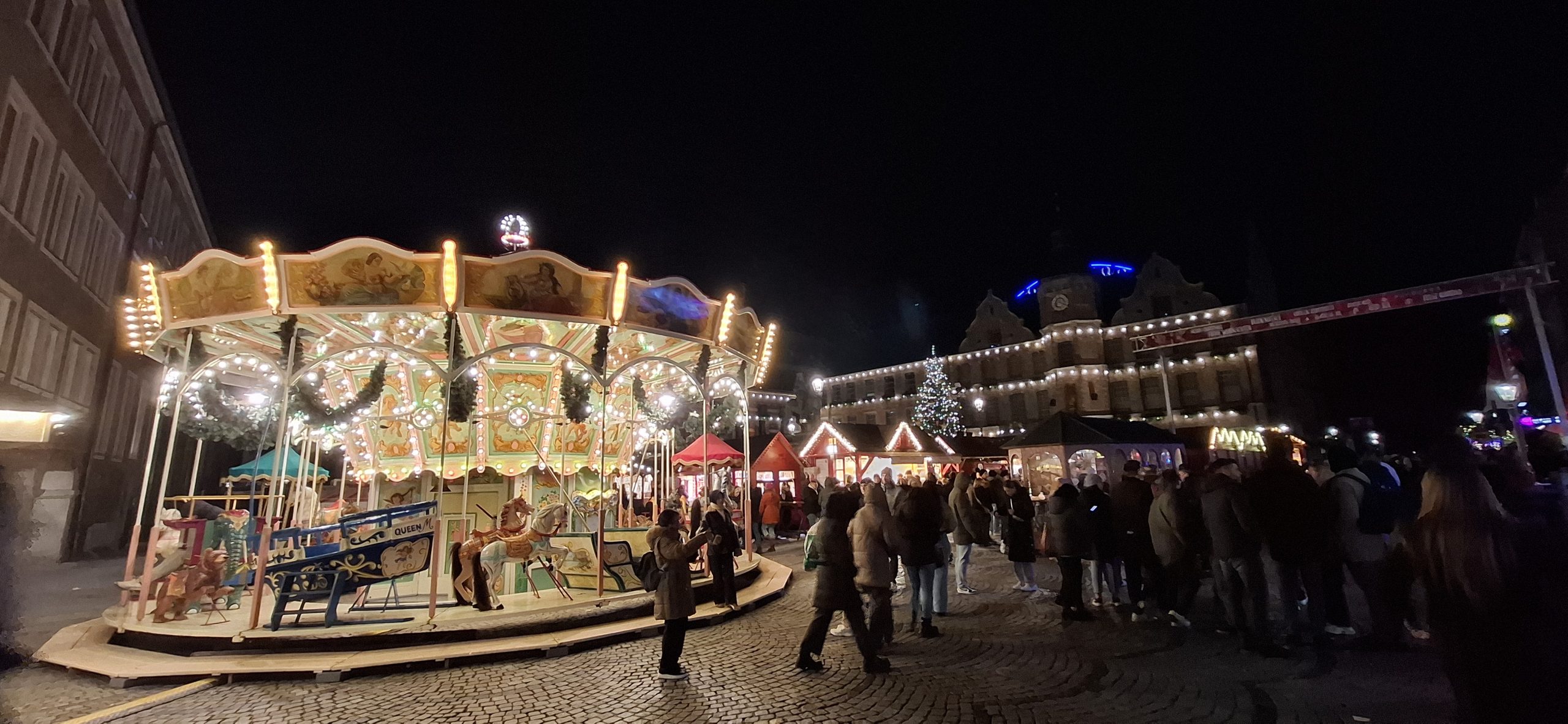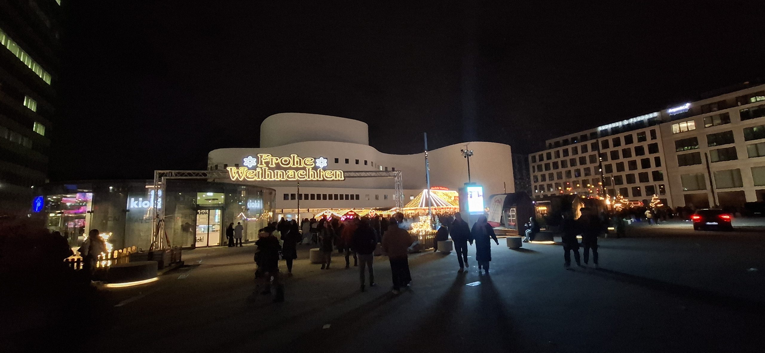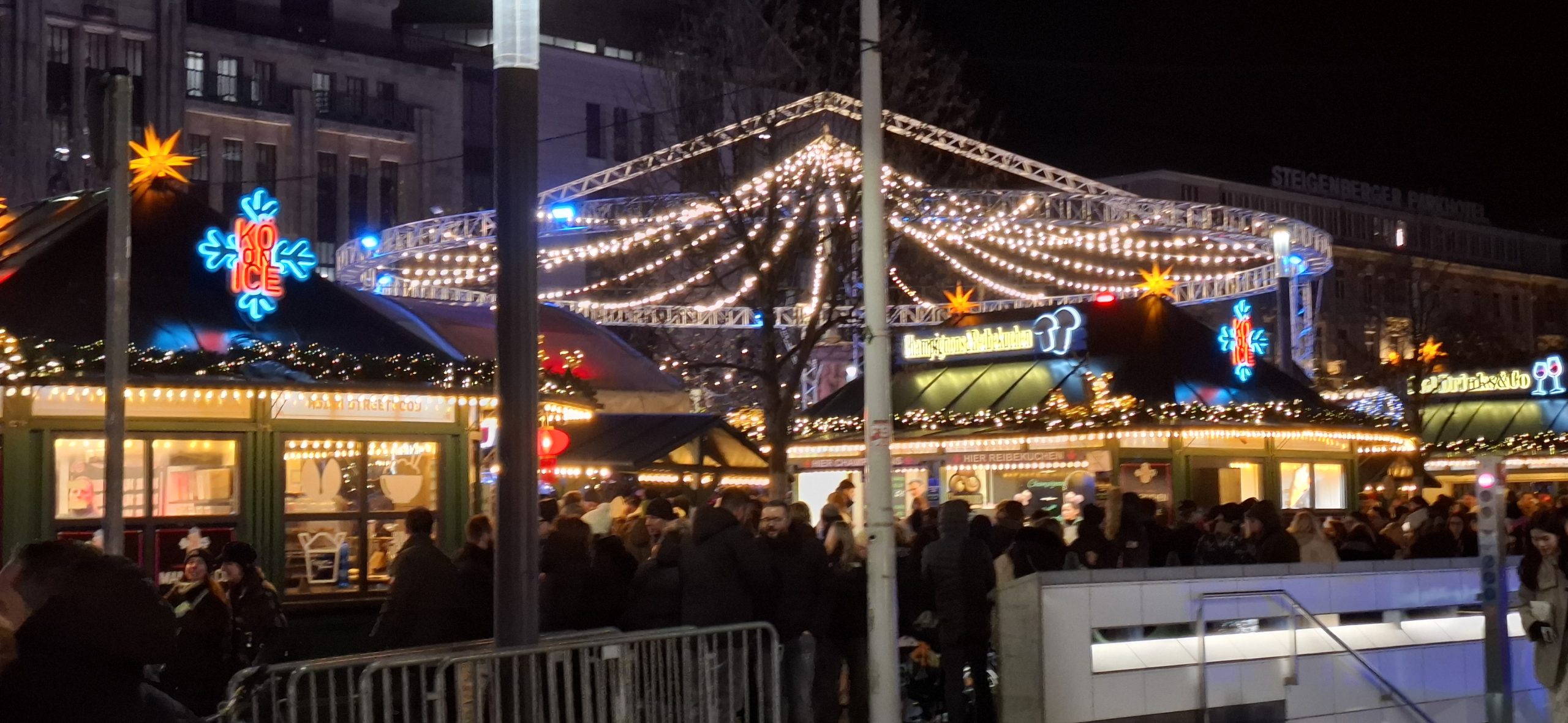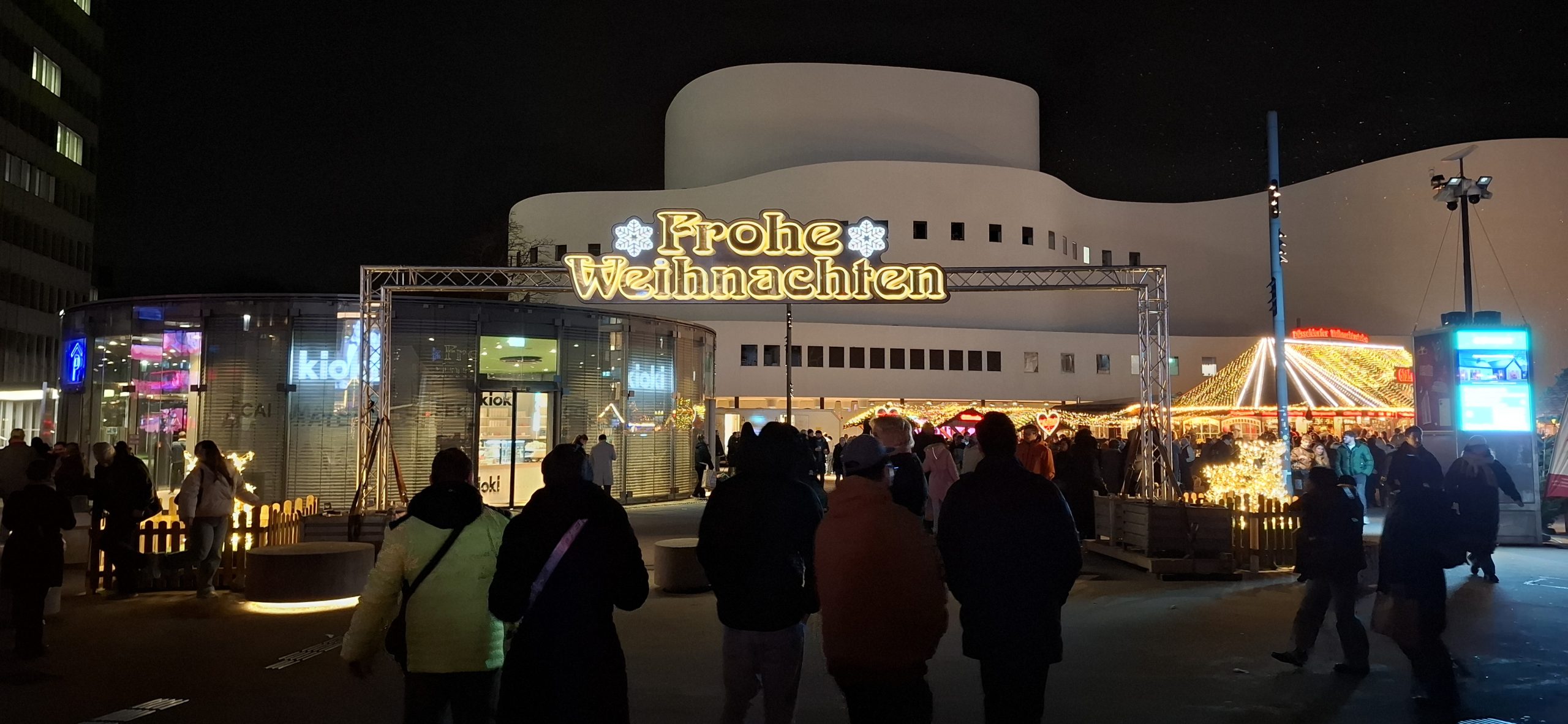 Am Samstag, dem 22. November 2025, fuhren wir nach Düsseldorf. Dies war dieses Jahr unser erster Weihnachtsmarkt. Wir parkten wie immer und haben überraschenderweise relativ direkt einen Parkplatz bekommen. Wir gingen den üblichen Fußmarsch zur und über die Brücke, an der Promenade entlang, vorbei am ersten Weihnachtsmarkt, direkt am Rhein mit dem Riesenrad. Diesmal hat dieser in der Mitte einen runden LED-Kreis mit verschiedenen teils überhaupt nicht lesbaren Werbeeinblendungen gehabt.