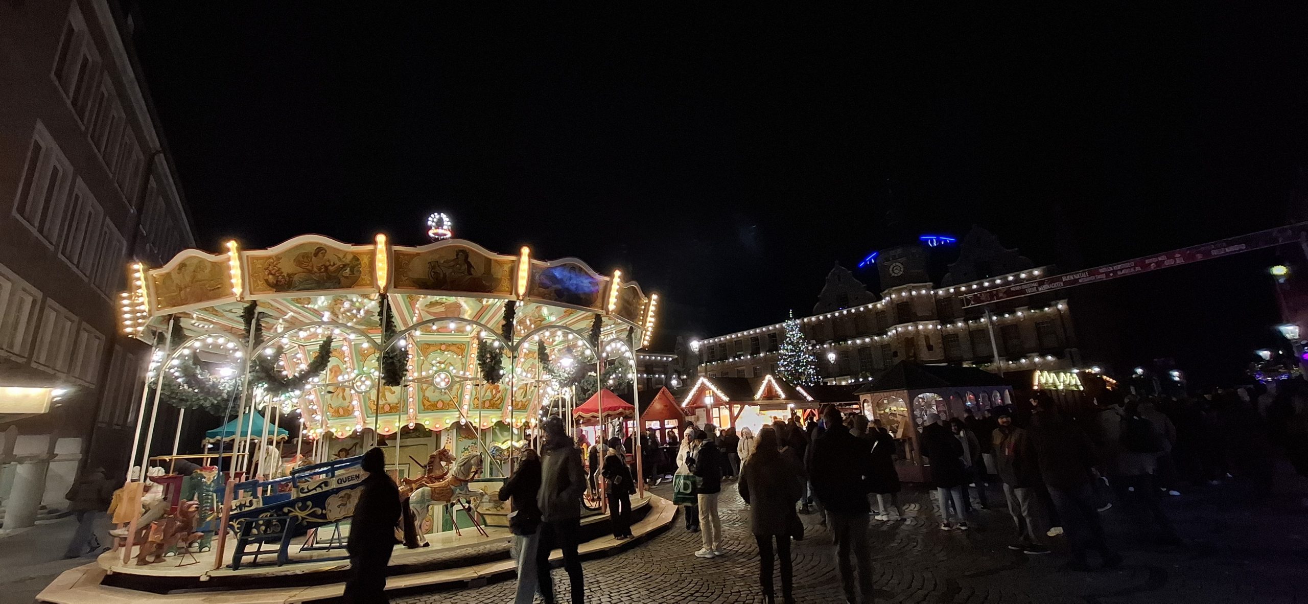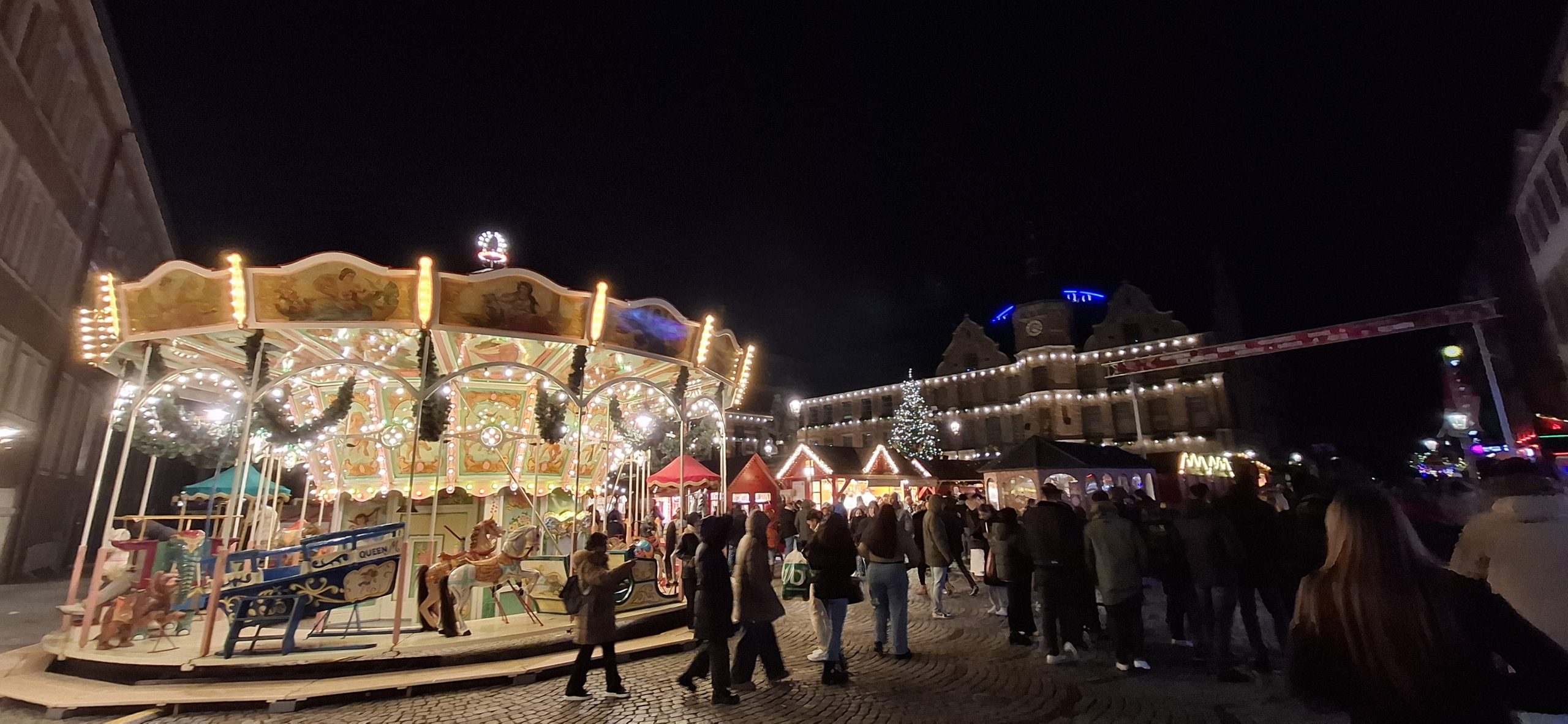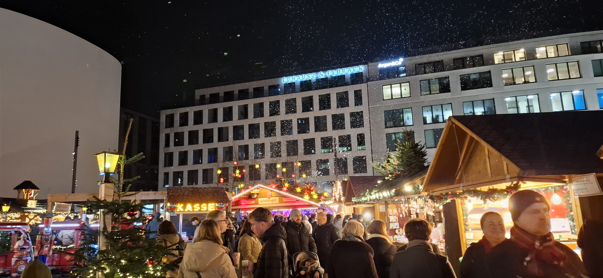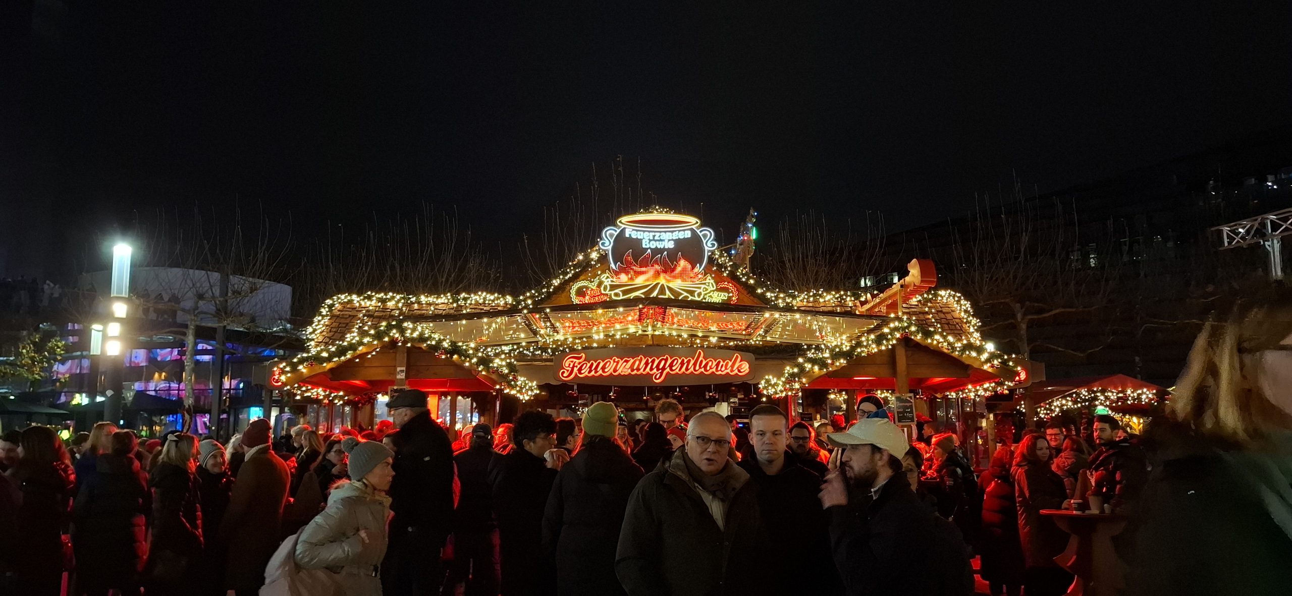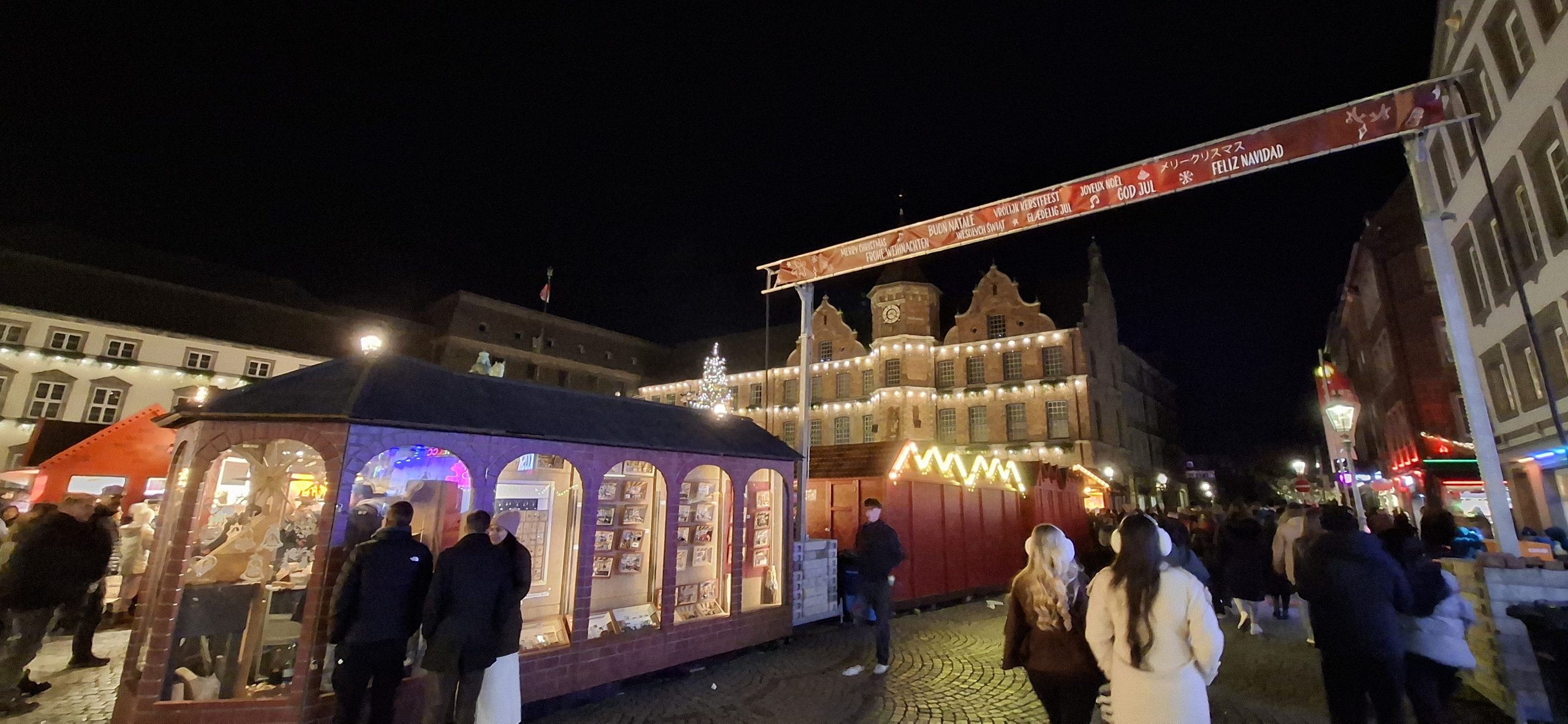 Am Samstag, dem 22. November 2025, fuhren wir nach Düsseldorf. Dies war dieses Jahr unser erster Weihnachtsmarkt. Wir parkten wie immer und haben überraschenderweise relativ direkt einen Parkplatz bekommen. Wir gingen den üblichen Fußmarsch zur und über die Brücke, an der Promenade entlang, vorbei am ersten Weihnachtsmarkt, direkt am Rhein mit dem Riesenrad. Diesmal hat dieser in der Mitte einen runden LED-Kreis mit verschiedenen teils überhaupt nicht lesbaren Werbeeinblendungen gehabt.